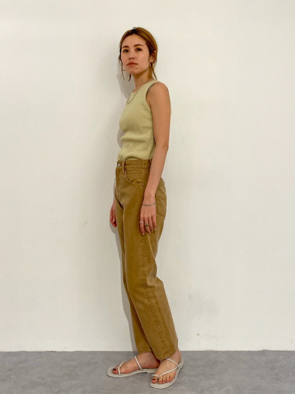 タンクpis、デニム25インチ着用です♡ 160センチ25インチで足首が隠れるくらいになります!ヒールがないサンダルでも綺麗に履いていただけます! アメスリのタンクはこれからの時期に何枚も持っておきたいアイテムです♡