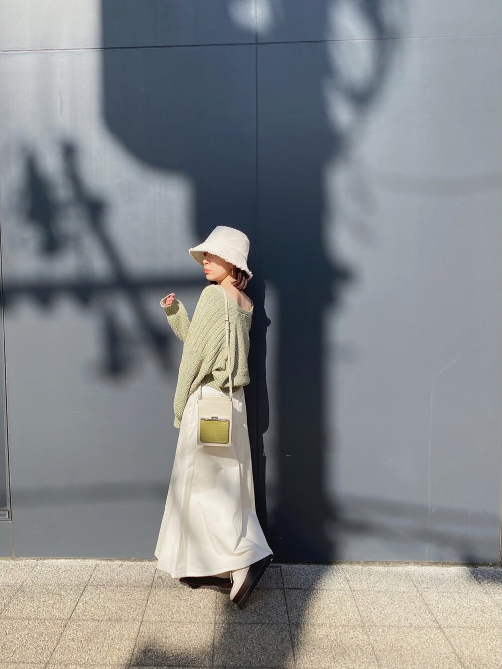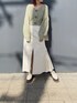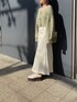 2色の糸が混ざり合ったニットカーデです。明るいグリーンで春らしさが全面に出ててかわいい♡淡いトーンでまとめて頂くとより柔らかい雰囲気でフェミニンなスタイリングが出来ます!袖のボリュームや、デコルテの開き具合も女性らしさを演出してくれます♡ 露出が苦手な方は、インナーにロンTなどをレイヤードするとカジュアルダウン出来て◎デニムとの相性も良いです!! スカートは大胆に開いたスリットがマーメイドラインをより際立たせてくれます!