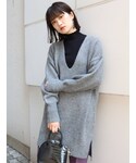 ちょっといい子ちゃん風スタイリング♫ 【ニット】首元がザックリと深めに開いたニットチュニックは今季トレンドのレイヤードスタイルに活用しやすいです。わたしは少しラフさも出したかったので、ベーシックなロンTをレイヤードしました!これからの季節ですと、フィット感のあるタートルやシャツを入れるのも綺麗めな雰囲気にチェンジ出来てオススメです◎ かなりゆったりとした長めなチュニックなので、155cmのわたしはミニワンピとしても着れちゃいます♡ サイドにスリットが入っているので、中にはインナーショーパンを着用しております。他にはプリーツスカートなどを合わせてゆるズルコーデも可愛いです◎