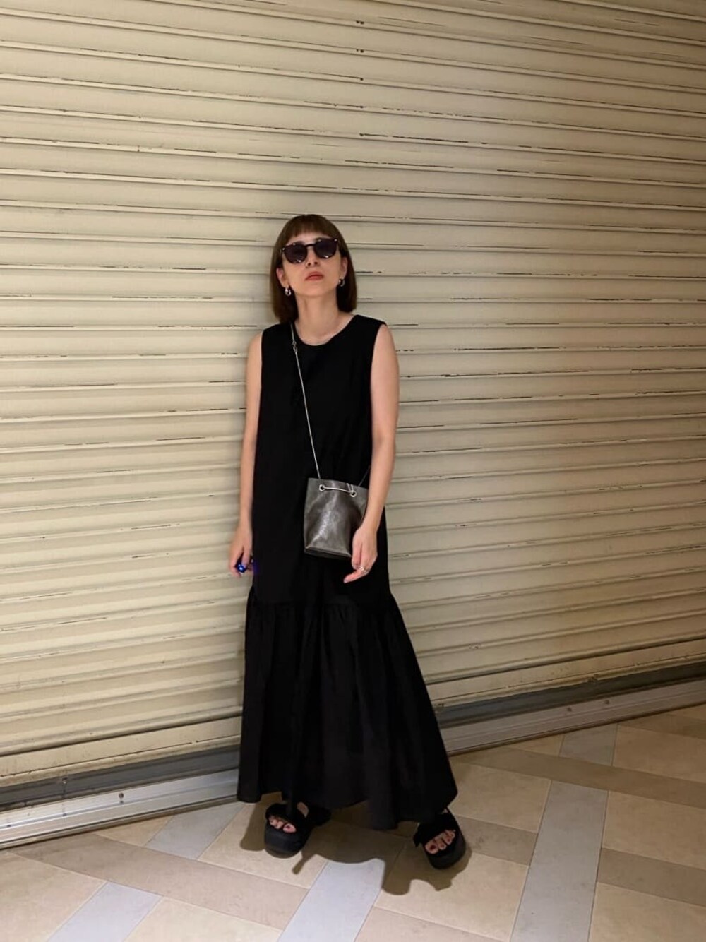 大人のブラックリゾートコーデ 1枚でサラッと着れる、これからの熱い夏にぴったりのワンピース♡ 裾がティアードになっていて歩いた時に大胆に揺れるのが、可愛すぎます!!シンプルだからこそ、かっこよく着こなしたかったのでブラックをチョイスしました◎ 日焼けや室内の冷房対策に、ロンTを肩がけしてもワンポイントになってこなれ感も出てお洒落♡