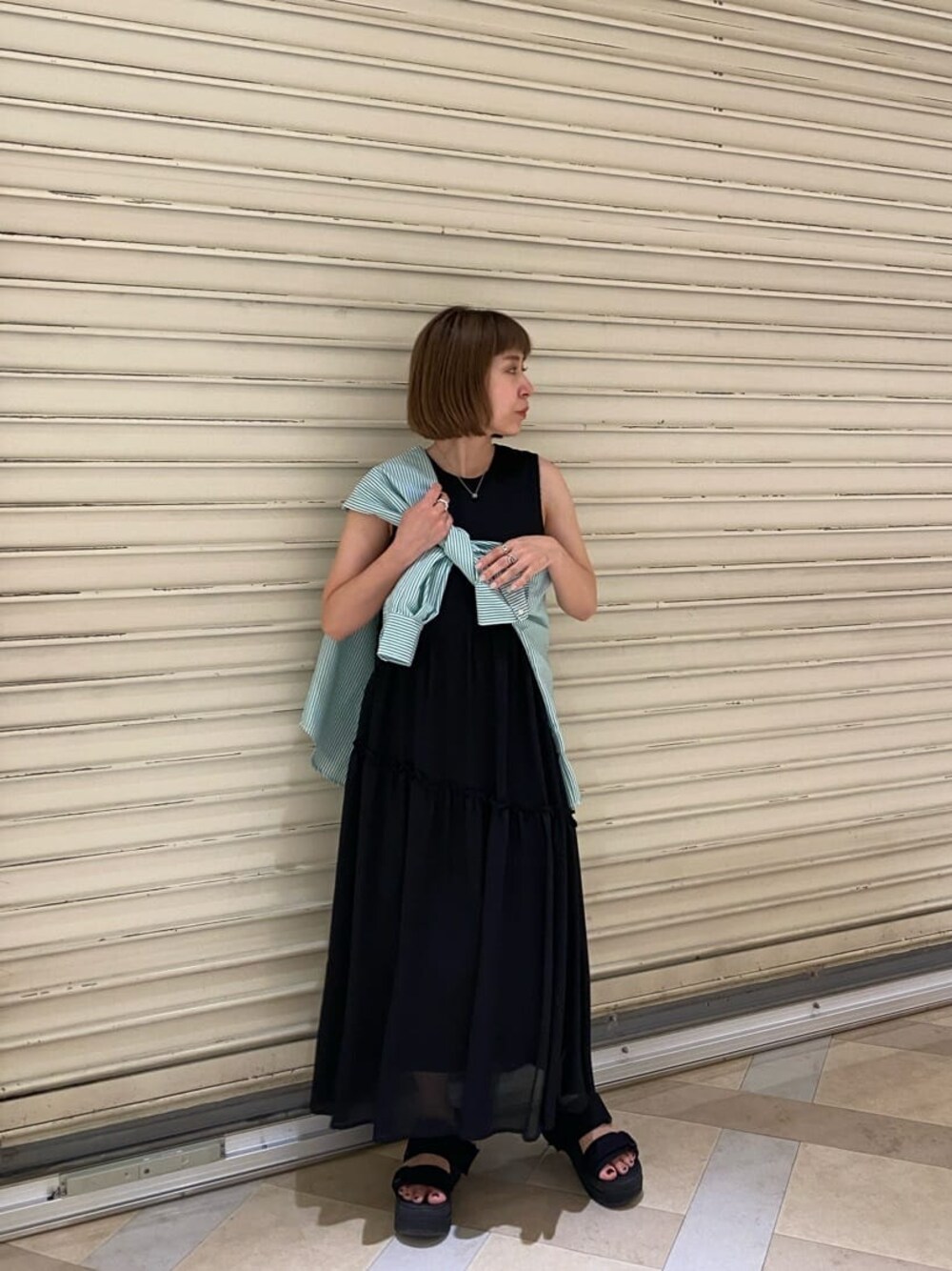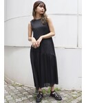 大人のブラックリゾートコーデ 1枚でサラッと着れる、夏にぴったりのワンピース♡ 切り替えになったティアードが歩いた時に大胆に揺れるのが、可愛すぎます!!シンプルだからこそ、かっこよく着こなしたかったのでブラックをチョイスしました◎ 日焼けや室内の冷房対策に、ロンTやシアーシャツを肩がけしてもワンポイントになってこなれ感も出てお洒落♡