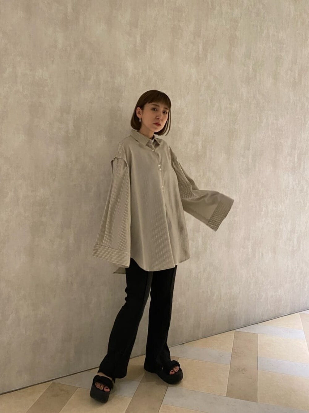 どカジュアルにならないモードな雰囲気でかっこよく着れるシャツコーデ♡ 【シャツ】ストライプシャツはカジュアルアイテムではありますが、MURUAならではのワイドスリーブで個性的!! 何通りもの着方があるので、その日の気分で全く違う印象に♡ 腰回りが隠れる長めの丈なので、細身のパンツも安心して合わせられます。ハリ感のあるストライプシャツは今年のトレンドアイテムとして、1枚持っておいて絶対損はなしです!! 【シャツ】ストライプシャツはカジュアルアイテムではありますが、MURUAならではのボリュームスリーブで女性らしさもしっかりと出せます◎ 後にタックが入っていることでバックスタイルもふわっとしていてかわいい♡ 腰回りが隠れる長めの丈なので、細身のパンツも安心して合わせられます。スタンドカラーなところもきちんと感が出て好きなポイントです。ハリ感のあるストライプシャツは今年のトレンドアイテムとして、1枚持っておいて絶対損はなしです!!