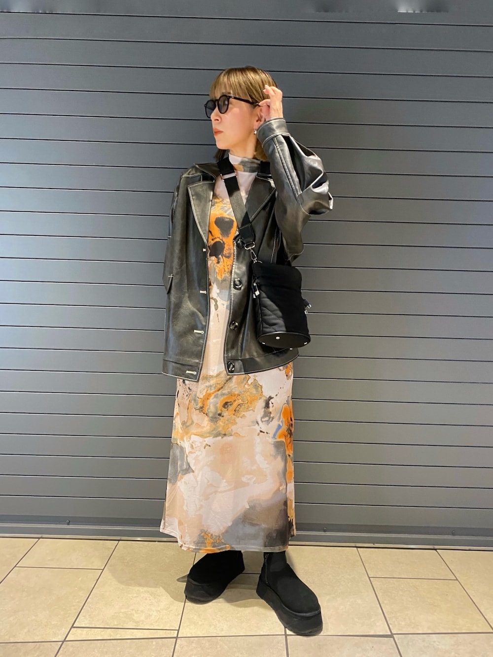 個性派ワンピコーデ 【ワンピース】もやっとした抽象的な柄と配色がとにかくおしゃれ見えします。全部シアーなので透け感はありますが、セットでペチコートも付いてくるので1枚で着て頂けます。下にデニムを重ねたりして大人コーデができます。 【ジャケット】MURUAの定番レザージャケットが今年はミドル丈になって登場♡身長155cmでおしりが隠れる丈で着て頂けます。タイトなボトムを合わせても安心です。ヴィンテージ感のある加工がおしゃれ!様々な系統に合わせて頂けるのでマストでGETしたいアイテムです!