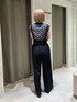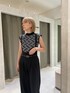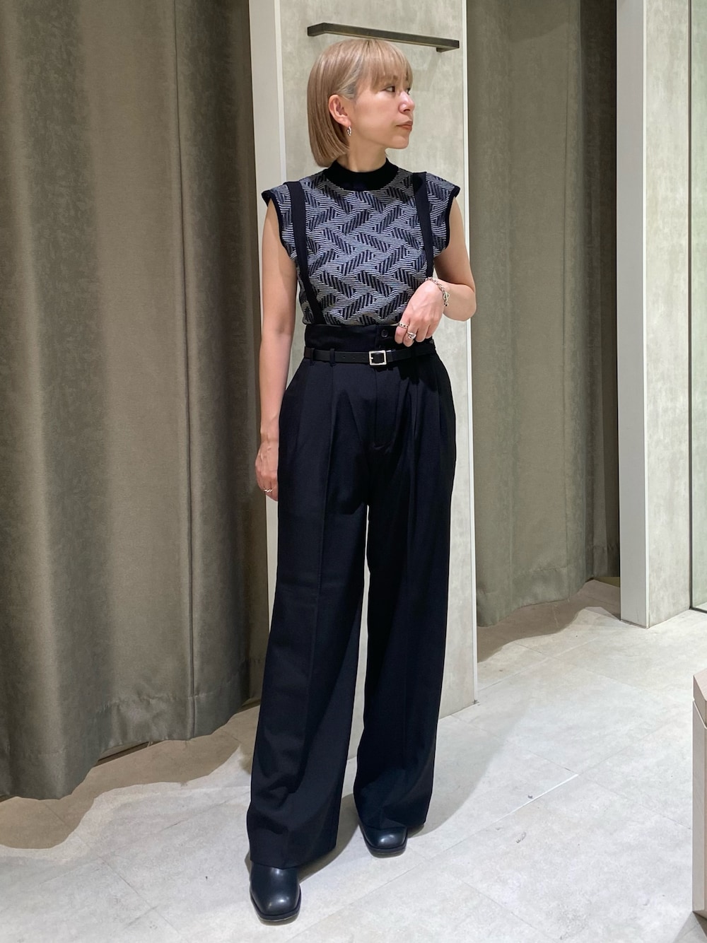 MURUA定番のコーデが今年も登場 【トップス】モードな雰囲気で着れる柄トップス。ニットですがシャリ感のある素材で今の時期から使えます。落ち着いたカラバリなので秋はジレやジャケットなどのインナー使いにもおすすめです。 【パンツ】ワイド過ぎないシルエットとセンタープレスが縦のラインを強調。更にハイウエストで脚長効果抜群です。サスペンダーとベルトは取り外し可能な為、雰囲気を変えてシーズンレスで使えるパンツです。オフィスカジュアルとしてもおすすめです。 【ブーツ】ベーシックな形のブーツはどんなお洋服にでもあわせられます。ヒールも高過ぎず太めの為、安定感があります。