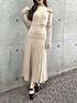 今までになかったホルターネックが好み🥺 袖も珍しいアシンメトリーの仕様…🥀 左側は腕にガーターデザインがあって EATMEらしいフェティッシュな印象に。 ウエストのボタンは開け閉め可能で、 左側から4つ開ける着こなし方がオススメ☺️☺️ ピタッとしてるけどスカート部分は アコーディオンプリーツで下半身のカバーも叶います◎ 肌寒い時は、 ウエストのボタンを閉めてジャケットと合わせたい〜☺︎
