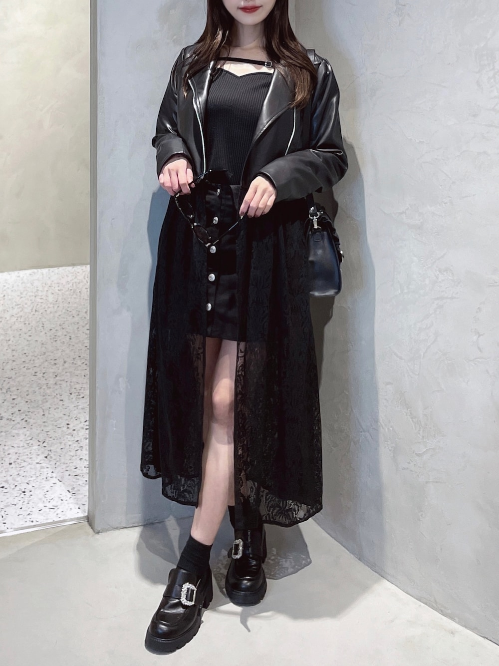 真里(EATME)のライダースジャケット「レースコンビフェイクレザーライダース【取外し可能】」を使ったコーディネート