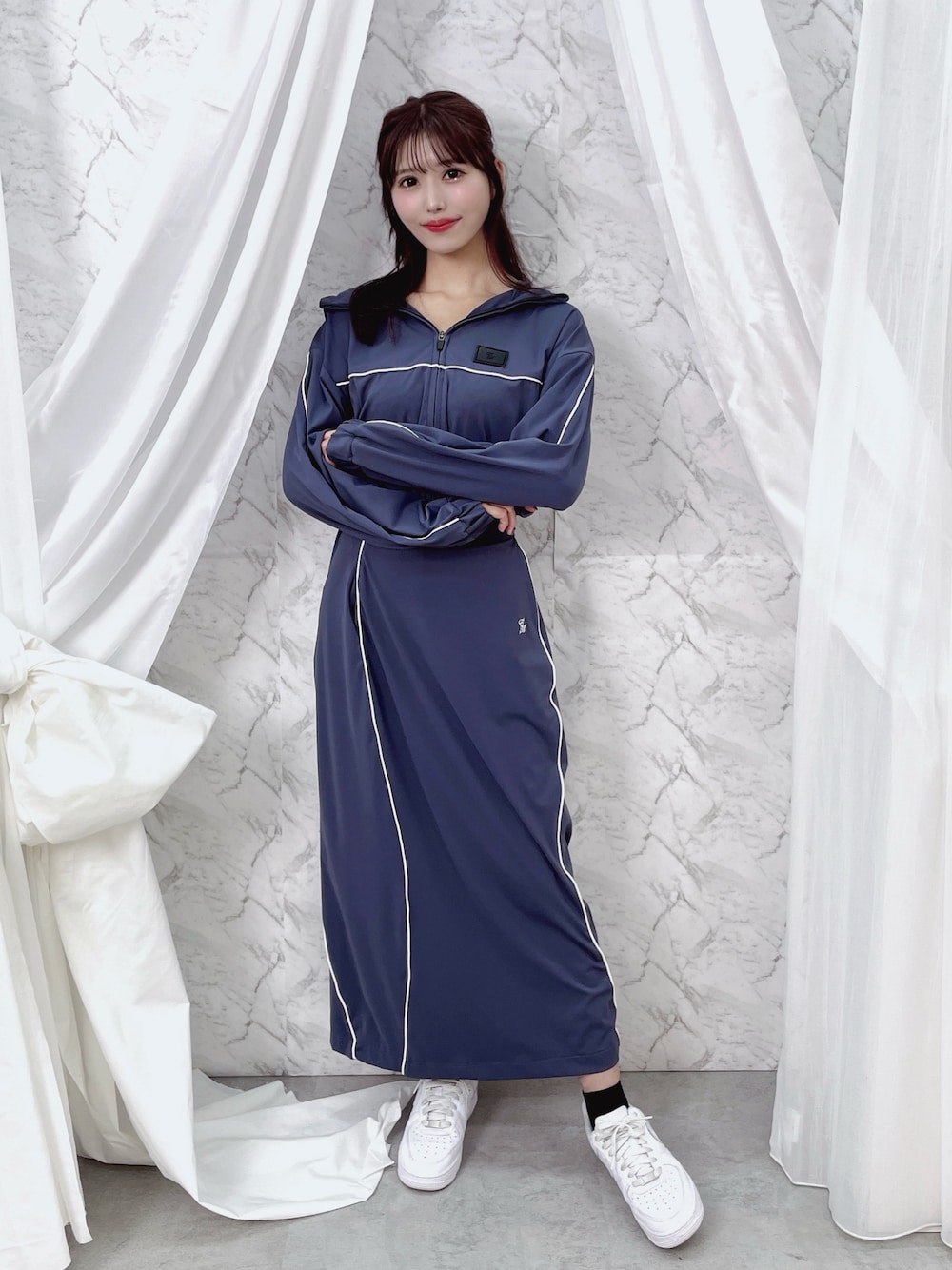 真里(EATME)のナイロンジャケット「トラックラインジャケット(セットアップ可能)」を使ったコーディネート
