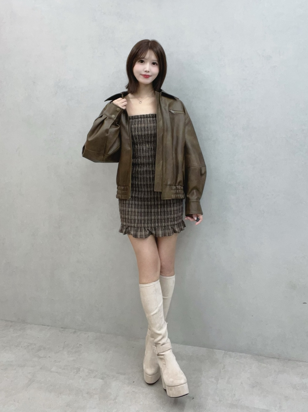 《アウター》 秋らしい色味にヴィンテージ加工をプラスしたブルゾン。 程よいハリとマットな光沢で上品見えします◎ ビッグシルエットとボリューム袖で中に着込める+ストールやマフラーとの相性も良いので、冬まで着倒せます👍🏻 ̖́- 《ワンピース》 シャツとリボンとワンピースの3点セットで着回しが自由自在です! このコーデは、ワンピースを着回しました。 シャーリングワンピは身体にフィットするので曲線美を作ってくれます。 今の時期から着られる素材の軽さです♡ チェック柄が華やかで写真映え間違いなし🖤ᩚ 肩にアジャスターが付いてるので丈感も調節可能です。 162cmで丈感は太ももくらい、タイトシルエットでフィットするので安心感あるミニ丈です。 《ブーツ》 “脚長シルエット”を叶える神ブーツ👢 24.5cmでLサイズ着用しています。 ストレッチスエード×美脚ラインでフィット感◎ 厚底×チャンキーヒールで安定感のある履き心地です!