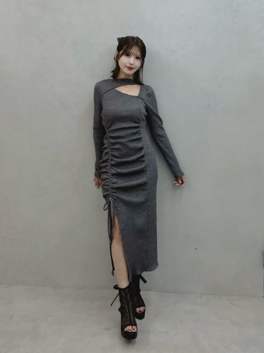 《ワンピース》 SNSで話題になったあの大ヒットワンピが、秋冬仕様にアップデートしました♡♡ デコルテ&ウエストのカットがEATMEらしい抜け感をプラス。 伸縮性のあるリブ素材で着心地が良いです◎ スカート部分はシャーリング入りで体型カバーが叶います。 162cmで丈感は足首上くらいです。 スリットがあるので低身長の方も軽やかに見える丈感でオススメ🍒◎ 《ブーツ》 透け感があり晩夏の今時期にも最適なシースルーブーツです🎀 24.5cmでLサイズを着用していてピッタリです。 ヒールは12.5cmと脚長効果抜群です♡