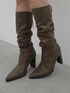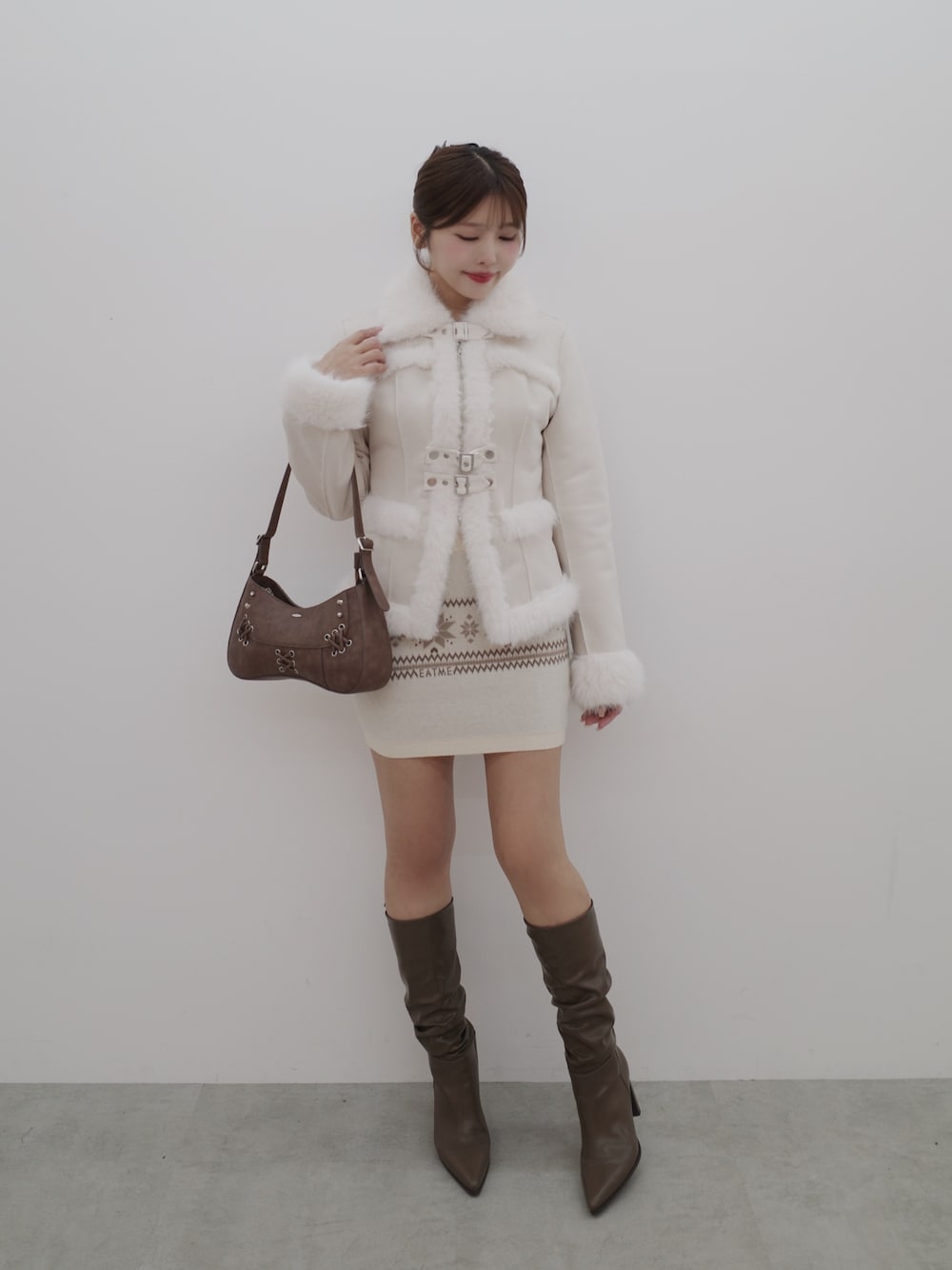 《バッグ》 ヴィンテージ加工フェイクレザーで高見え! 厚みのある素材で形崩れしにくいです。 レースアップとスタッズでEATMEらしいアクセント✓ 《ブーツ》 通勤や普段使いにも歩きやすい! 24.5cmでLサイズ着用しています。 足首のくしゅっと感が抜け感をプラスしつつ、脚を細く見せてくれる美脚ブーツ。 安定感のあるスクエアヒールは横から見るとスッキリ見え、歩きやすさと美シルエットを両立しました。 バックレースアップリボンで360度どこから見ても可愛さを演出できる一足です!
