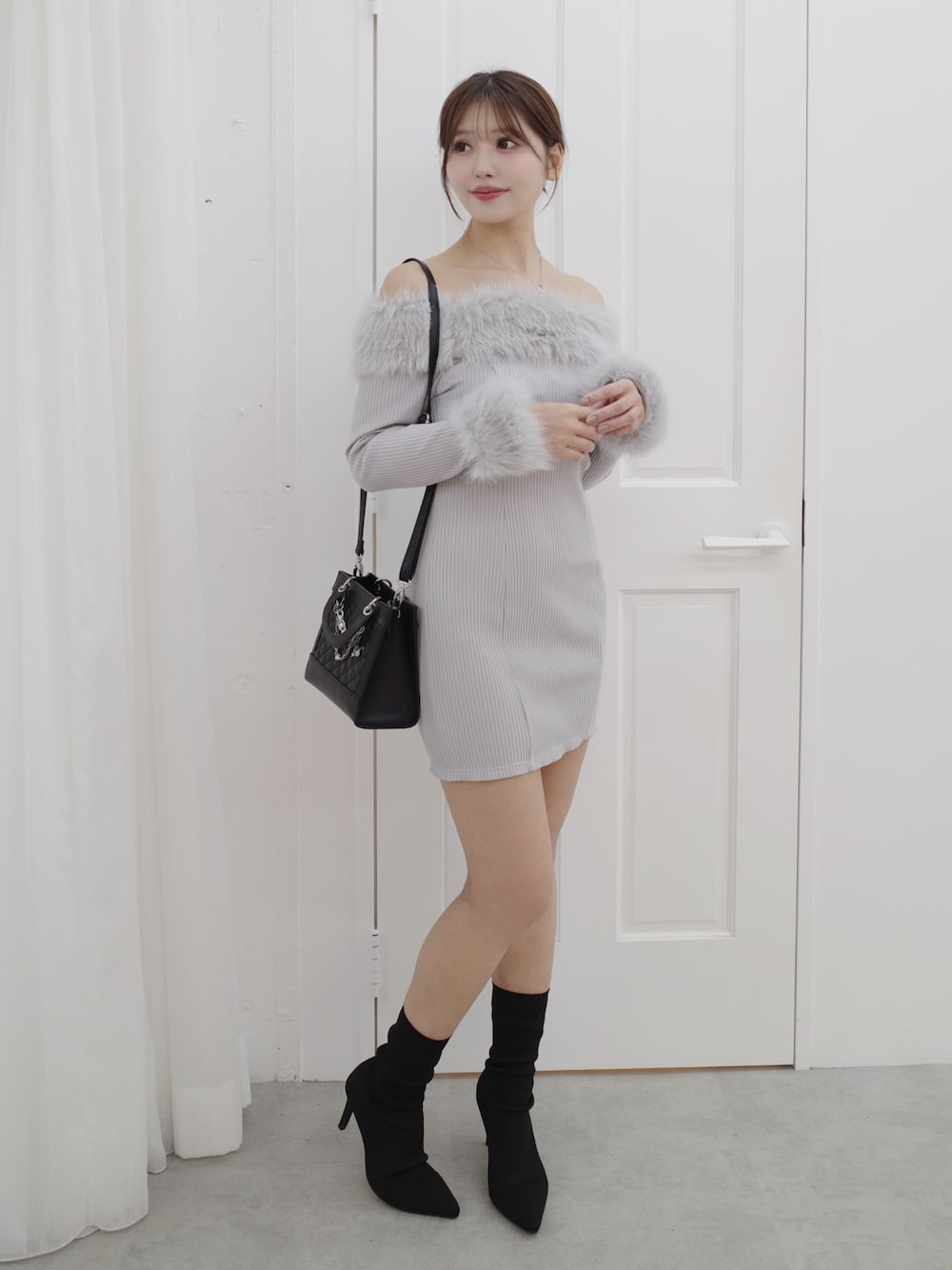 真里(EATME)のワンピース「フェイクファーオフショルミニワンピース」を使ったコーディネート