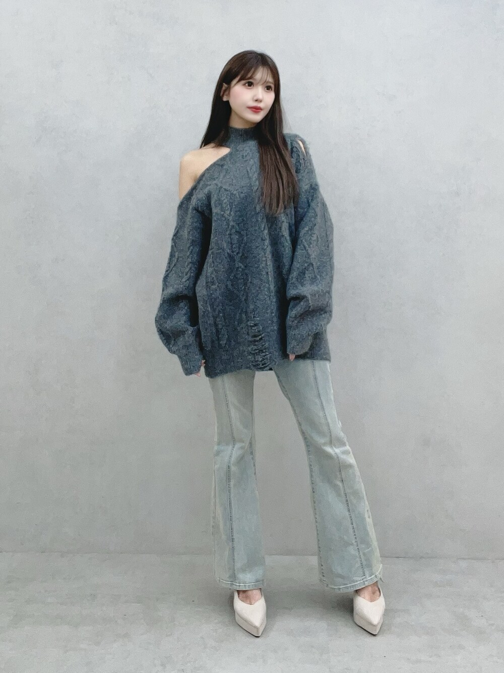 真里(EATME)のニット/セーター「ダメージワンショルニット」を使ったコーディネート
