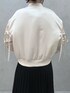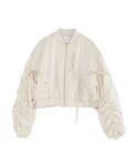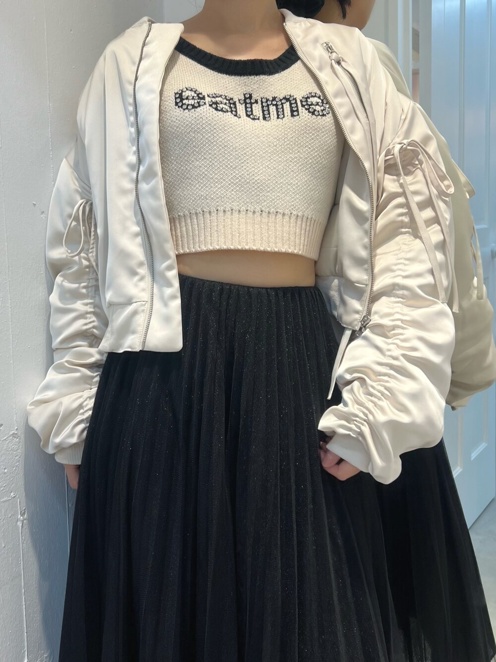 【トップス】 キラキラ輝くビジューで仕上げたeatmeロゴとバイカラーがかわいいニットトップスです♡ サラッとした糸で仕上げ、ややゆったりのシルエットなので、ゆるく、リラックスして着ていただけます! 【アウター】 リボンがポイントのマットサテンで仕上げたフェミニンムードのブルゾンです。中綿が入ってるので、春先まで着られるアイテムです!