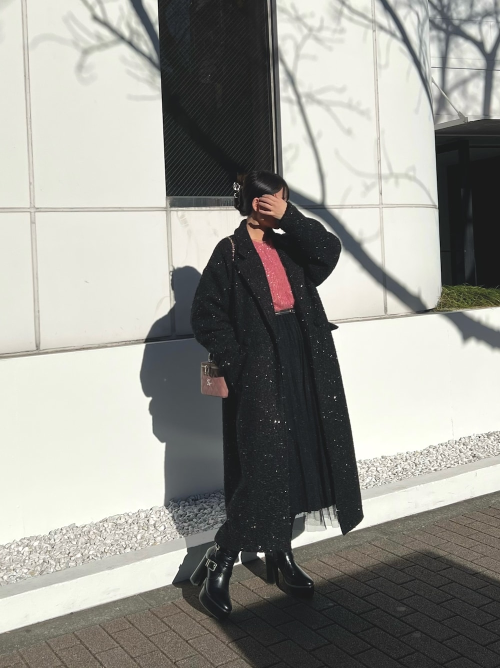 【アウター】 ラメブークレロングコート ラメ入りのブークレー素材が大人っぽく仕上げくれます。真冬にぴったりのアイテムです。ゆったりとしたサイズ感なので、厚手のニットやスウェットを着てもモコモコしないです! 【シューズ】 ベルトがポイントのショートブーツです! スクエアヒールは安定感があり、長時間歩いても疲れにくいです! 【バッグ】 E/Mチャームが目を惹くキルティングバッグです♡ マットな質感のフェイクレザーでコンパクトなサイズなのに、広めのまちで容量たっぷりなのもうれしいポイントです!お出掛けコーデのアクセントやカジュアルコーデの外しとしても一押しです!