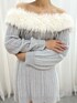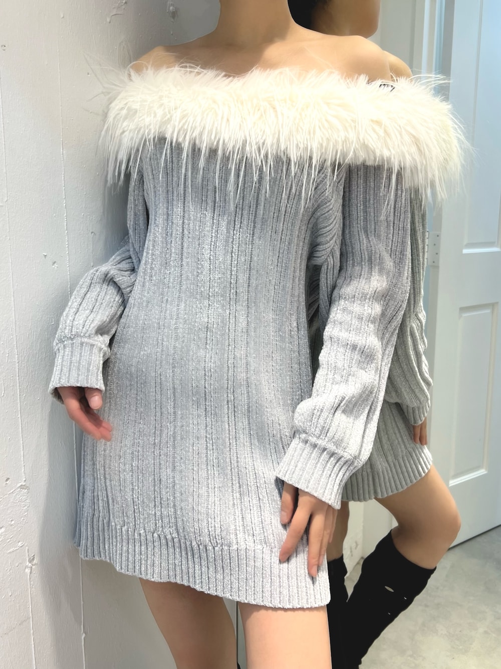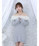 ふわふわフェイクファーがデコルテや肩ラインを華奢見えするオフショルニットワンピースです♡