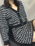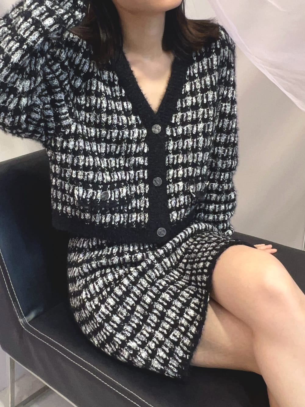 キラキラのラメ糸をミックスしたツイード ライクのニットスカートとニットカーディガンです!