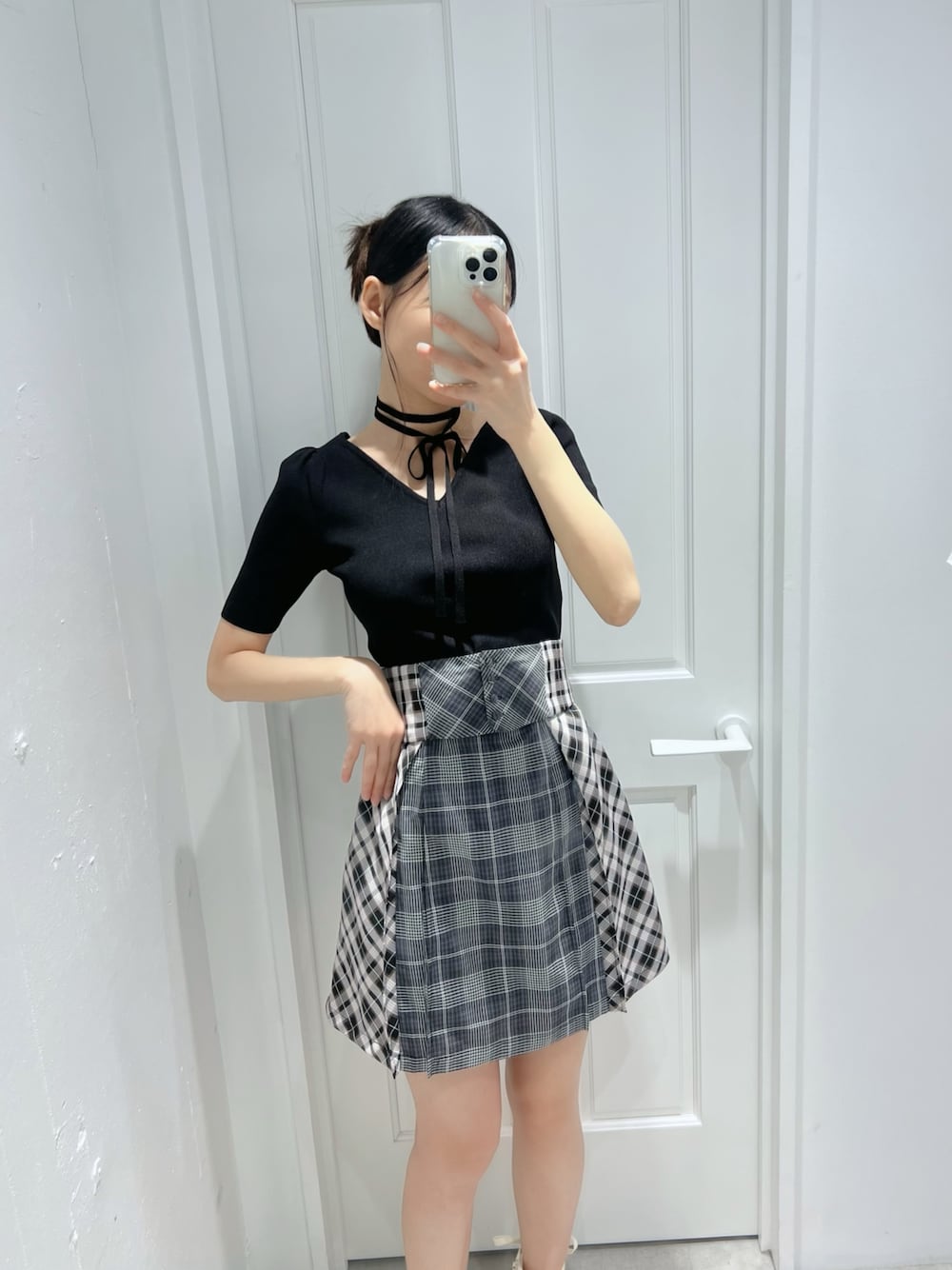 【EATME×MIKANA YAMAMOTO】 Special Collaboration スペシャルコラボのワンピース♡ サラッとしたニットに2種類のチェック柄を贅沢に使ったスカートがドッキングされた異素材感がポイントのワンピースです! ネックの同素材リボンとコルセットのリボンは気分に合わせてありなしで使っていただけます。 ウエストの後ろはゴムなので着心地◎ 深Vネックは顔まわりをすっきりしてくれます。スカートに施したBOXタックは程よく広がる台形シルエットは脚長効果抜群です。 1枚で着こなしが決まる優れた1着です!