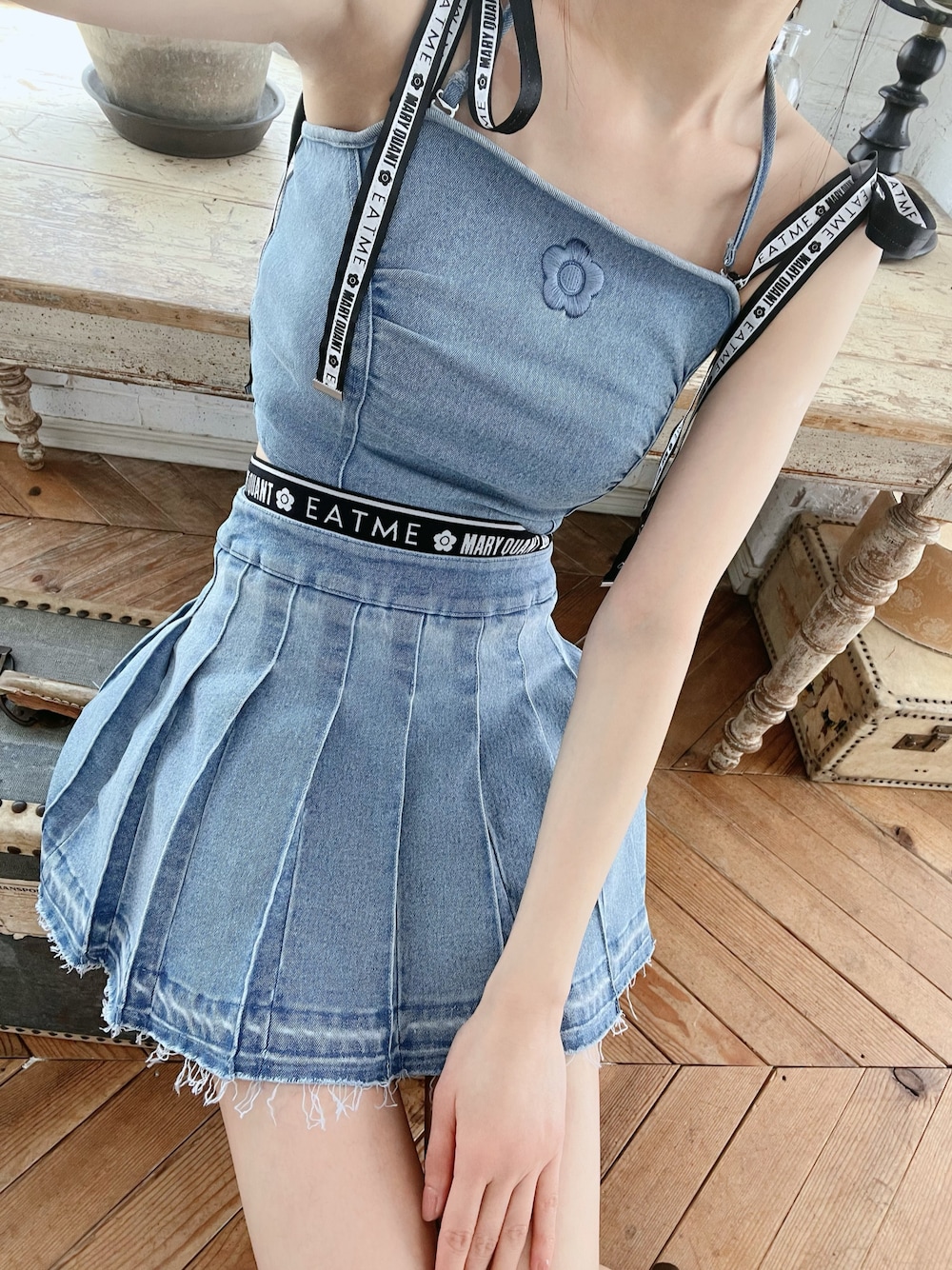 LAM(EATME)のデニムスカート「【EATME×MARY QUANT】ウエストマークデニムプリーツスカート(セットアップ可能)」を使ったコーディネート
