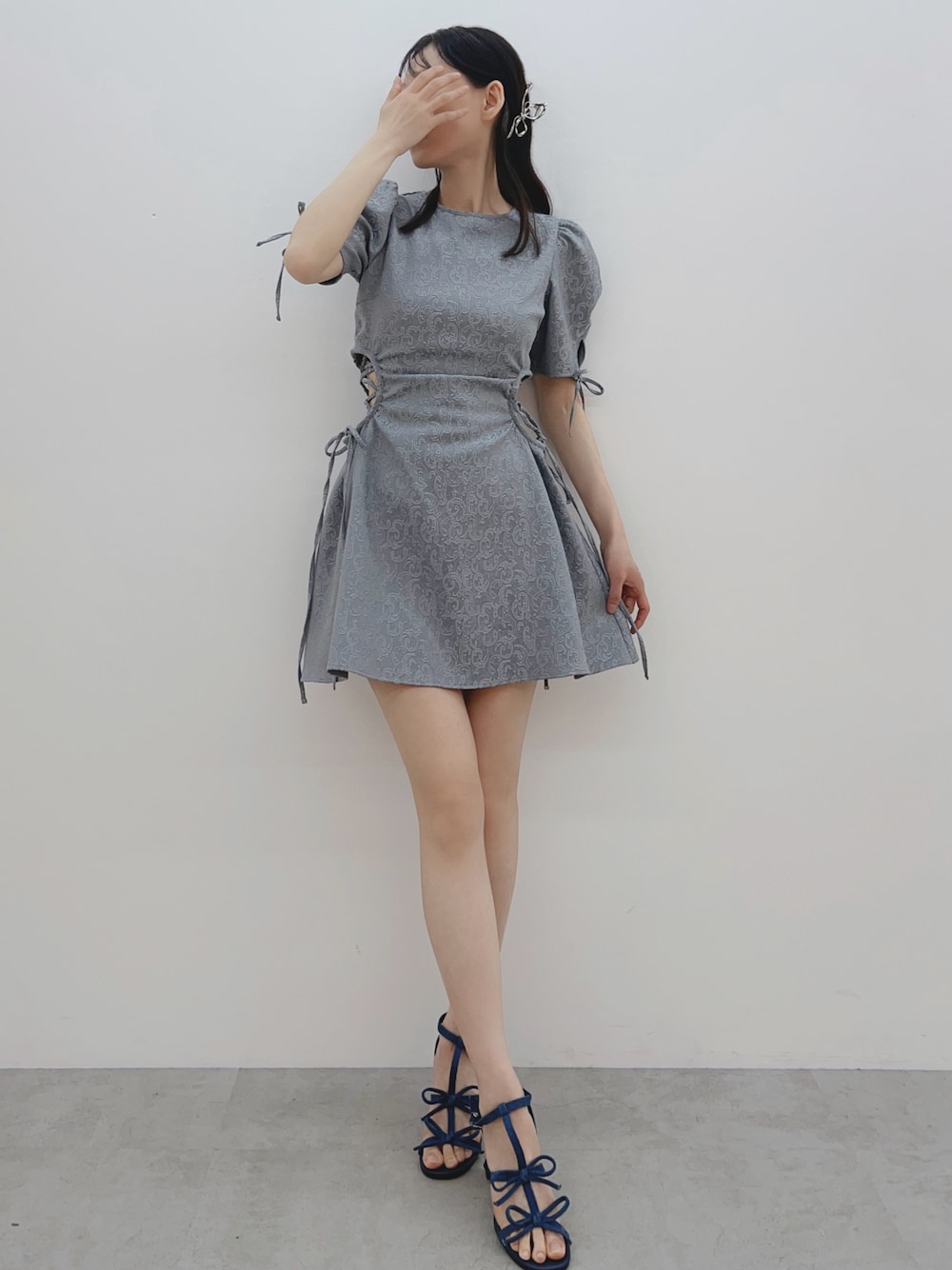 【ワンピース】 両サイドのカットアウトにレースアップを施し、センシュアルムードを演出してくれるワンピースです♡ パフスリーブのボリュームを少し減らしたのとより足長く見えるように着丈を短く調整しバージョンアップしました。 【シューズ】 ダブルリボンがかわいいサンダルです♡ 足のラインをきれいに見せてくれつつ安定感のあるフレアヒールは歩きやす<疲れにくい仕上がりです。カジュアルなアイテムからガーリーアイテムまで幅広く活用する優秀な1足です。