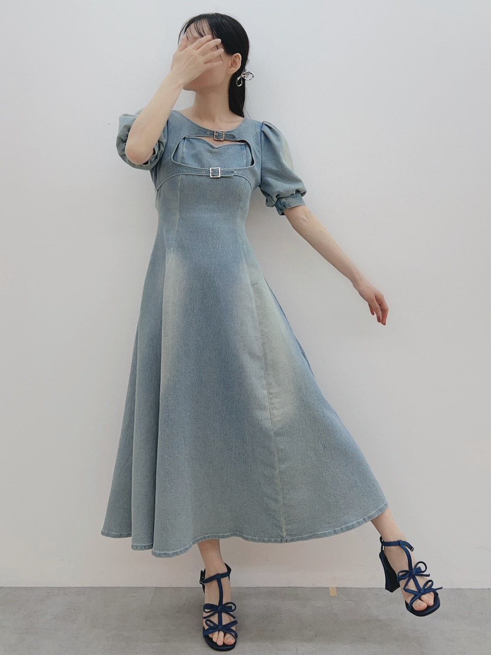 【ワンピース】 胸元にあしらったダブルベルトとハートカットデザインがポイントのワンピースです♡ フィットアンドフレアで女性らしさを演出してくれます。ストレッチの効いたデニム生地なので着心地抜群です。 【シューズ】 ダブルリボンがかわいいサンダルです♡ 足のラインをきれいに見せてくれつつ安定感のあるフレアヒールは歩きやす<疲れにくい仕上がりです。カジュアルなアイテムからガーリーアイテムまで幅広く活用する優秀な1足です。