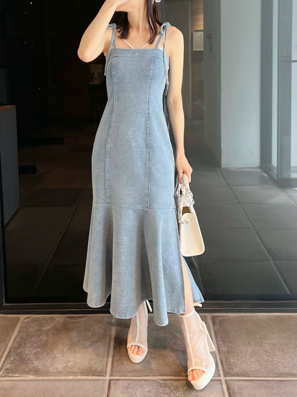 【ワンピース】 デニム見えするスウェット素材で作られた ベアワンピースです♡ 足が長く見えるようにマーメイドの切り替え位置を拘りました。 同じ素材のパーカーもあるので、セットで着るのもオススメです。 【バッグ】 かわいいリボンをあしらったフラップショルダーバッグです。 柔らかいフェイクレザー生地を使用し、たっぷりとギャザーを寄せた目を惹くアイテムです。 【シューズ】 透け感のあるメッシュ生地柔らかなフェイクレザー生地で仕上げだショートブーツです♡ 後ろのリボンがデザインポイントです。 デニムなどのカジュアルアイテムからガーリーアイテムまで幅広く活用できる優秀な1足です。