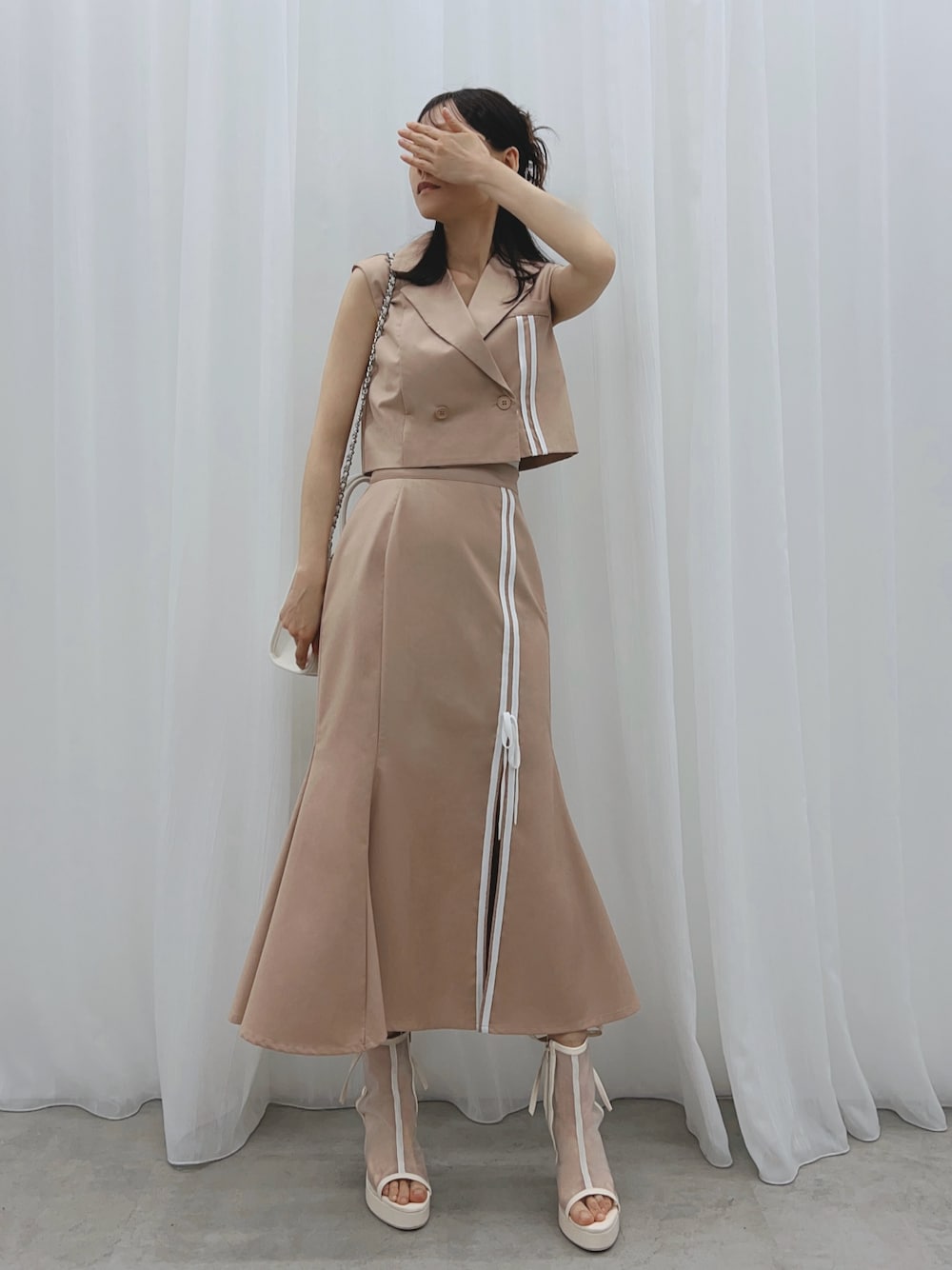 ラインショートベストにダブルラインマーメイドスカートを合わせたワントーンコーデです♡ ベストとスカートに施した配色ラインはアクセントとなり目を惹くポイントです。