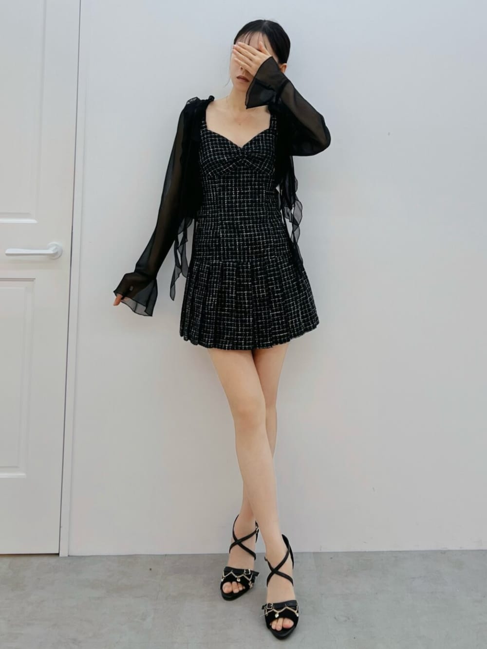 【ワンピース】 上品なツイード生地で仕上げたヘムプリー ツのワンピースです♡ 裾にあしらったプリーツは女の子らしさをプラスしてくれます。後ろはシャーリング仕様なので、体をフィットしてきれいなシルエットに魅せてくれます。 【カーディガン】 シアー感のある楊柳シフォン生地で作られたカーディガンです♡ 前後のフリルは歩くたびに揺れるのは目を引くポイントです。 【サンダル】 チェーンベルトにE/Mとハートとストーンのチャームをあしらったサンダルです♡ デザイン性高くフェミニンからカジュアルまで様々なコーデに合わせやすい1足です。 普段23.5cmでMサイズを着用しています。