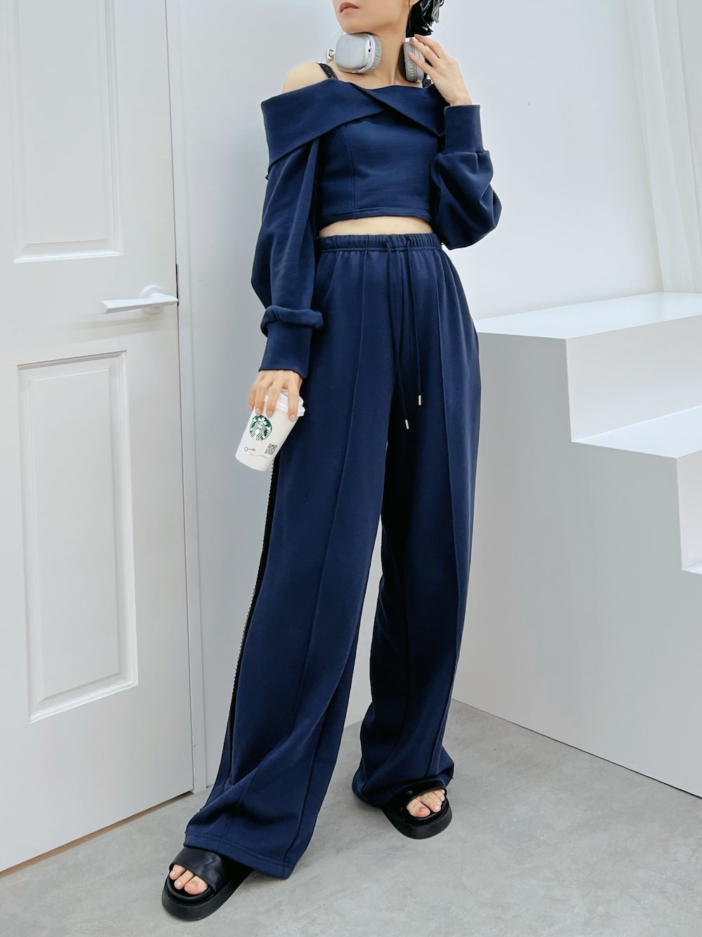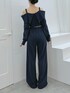 【トップス】 折り返しオフショルデザインが今年らしいトップスです♡ ボディラインに程よくフィットし、柔らかい肌触りで着心地抜群です。肩紐はレース素材になっています。 【ボトムス】 フロントにピンタックが施しているので、足を長く魅せてくれるワイドパンツです♡ ウエストはゴム仕様なので着心地の良さでリラックス度アップします。