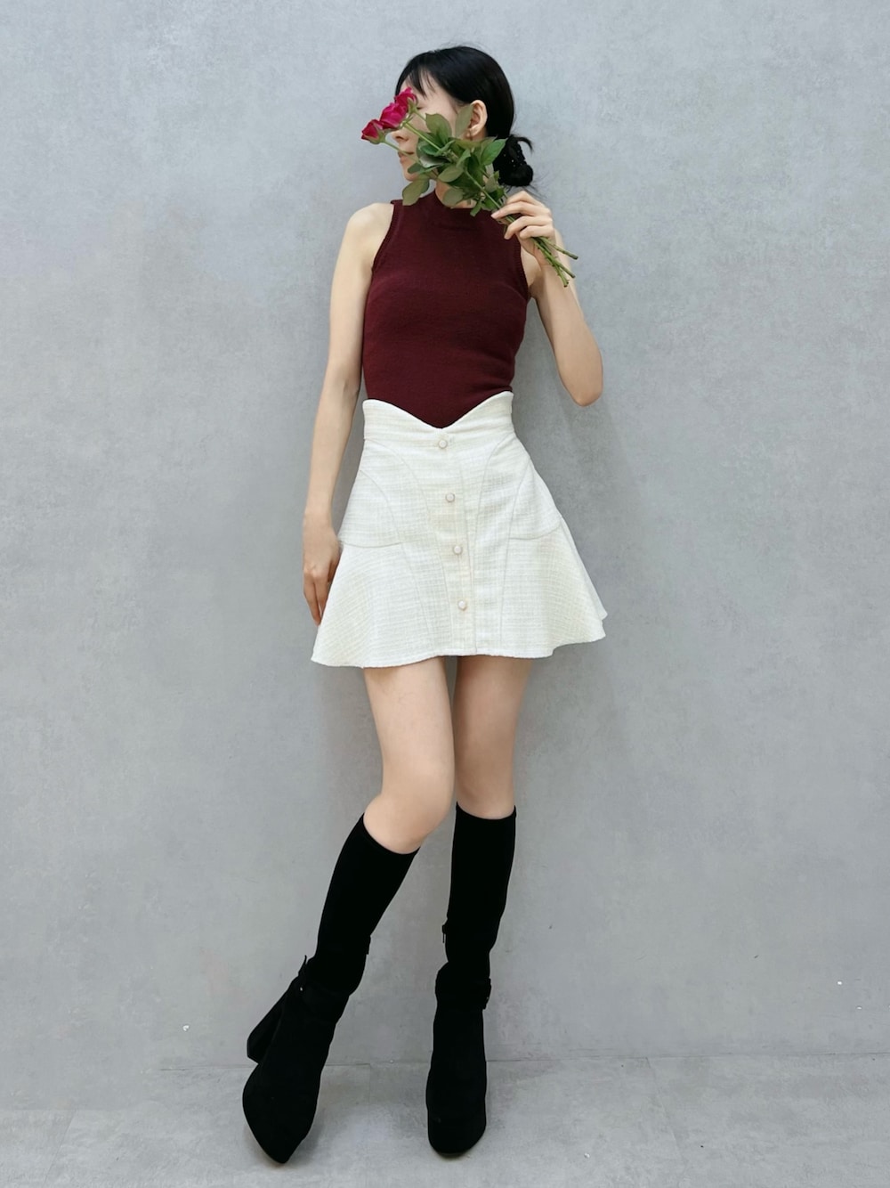【トップス】 ぴたっと身体にフィットしつつ、伸縮性あるニット素材で着心地◎ ヘルシーな肌見せデザインで華奢な印象をプラスします。着回し力抜群なアイテムです。 【スカート】 大人っぽさをプラスしてくれるツイード素材で仕上げたスカートです♡ フレアシルエットは可愛らしさを演出してくれます。 【シューズ】 ストレッチの効いたスエード素材で仕上げたロングブーツです♡ くるぶしにあしらったベルトは目を惹きます。 23.5cmのMサイズを着用してます。
