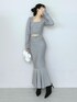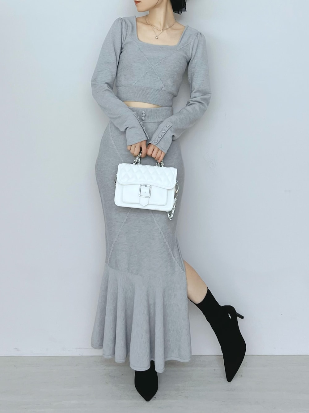 【トップス】 モチっとした糸で編み上げたニットトップスです♡ スクエアネックはデコルテをキレイに魅せてくれます。フロントに施したクロスのケーブル編みは拘りポイントです。 【スカート】 美シルエットのマーメイドニットスカートです♡ モチっとした糸で編み上げました。左脇に深めのスリットが入っており、歩くたびに足がチラッとキレイに魅せてくれます。 【シューズ】 ニット素材で仕上げたショートブーツです♡ 伸縮性のあるので、足をフィットして美脚を演出してくれます。ポインテッドトゥーで足をさらに長く魅せてくれます。 23.5cmのMサイズを着用してます。 【バッグ】 上品なキルティング仕様で仕上げたバッグです♡ チェーンショルダーは取り外せるので、ハンドバッグとしても使っていただけます。