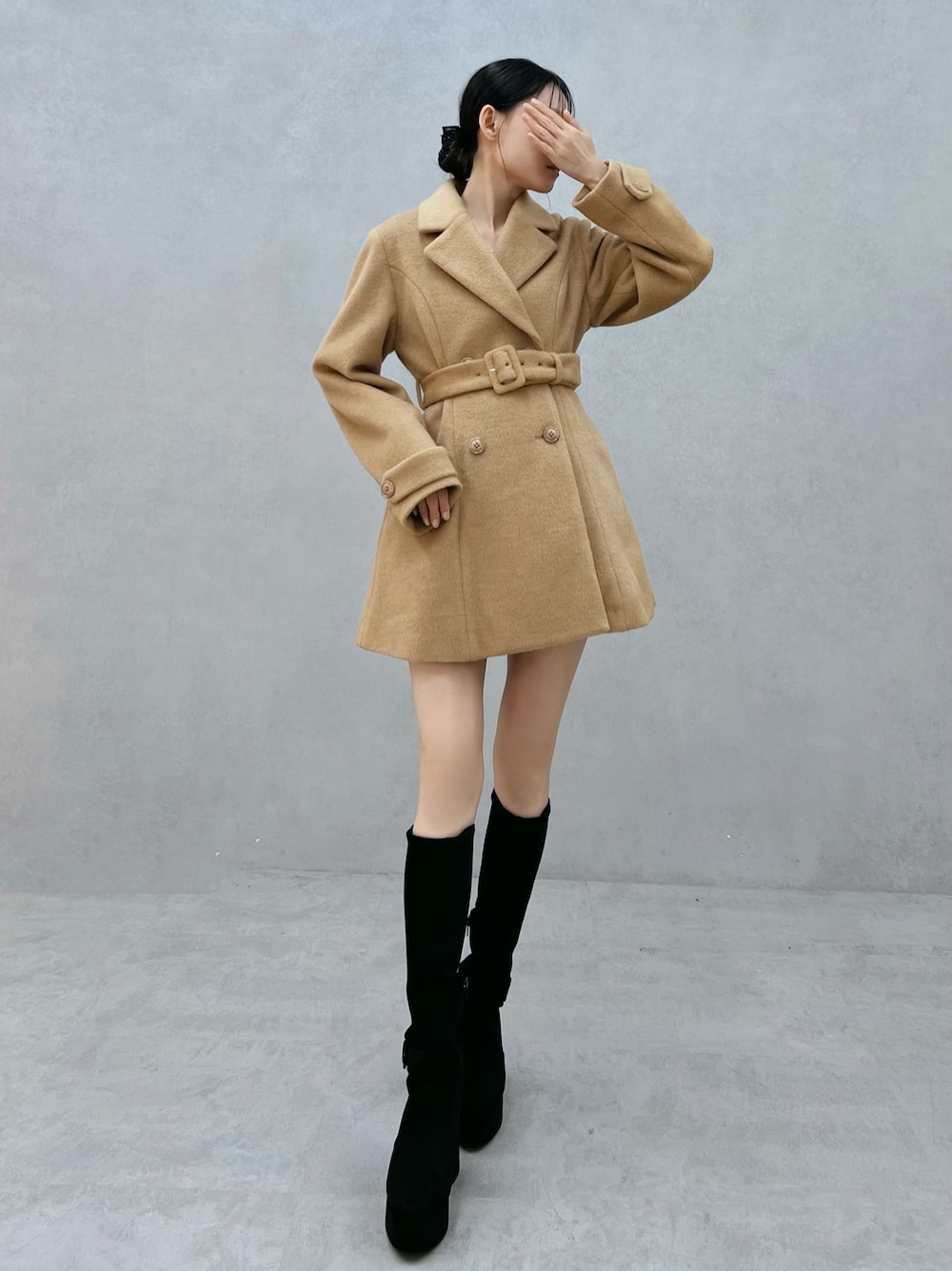 【コート】 ウエストマークがポイントのショートコートです♡女性らしいスタイルからカジュアルまで、幅広いコーデに馴染む1着です。 【シューズ】 ストレッチの効いたスエード素材で仕上げたロングブーツです♡ くるぶしにあしらったベルトは目を惹きます。 23.5cmのMサイズを着用してます。