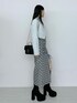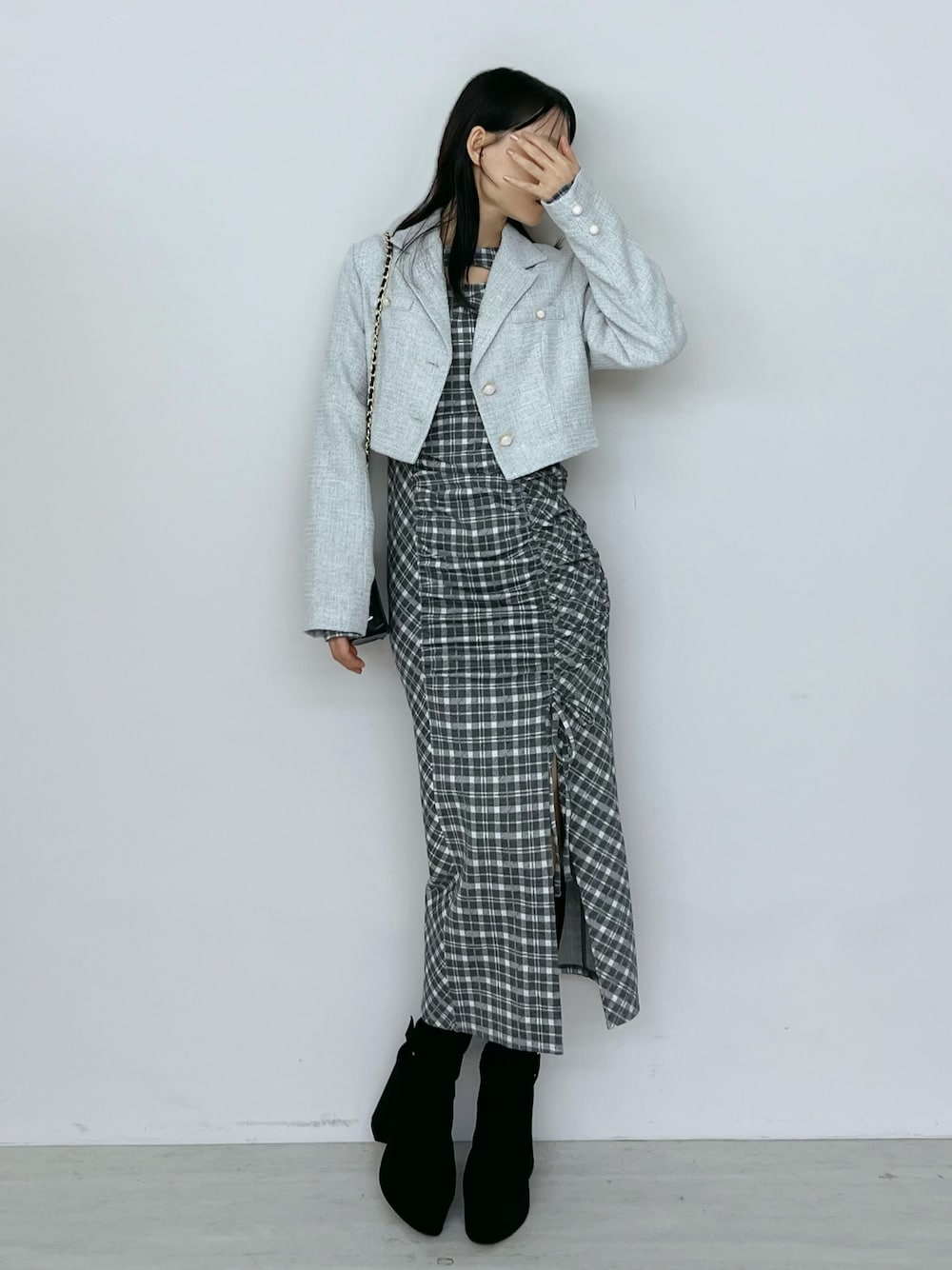 【ワンピース】 トレンドのチェック柄で仕上げたデコルテ ワンピースです♡ 脇パネル切り替えはバイアス取りにしているので、ボディラインをキレイに細く魅せてくれる1着です。 【ジャケット】 大人っぽさをプラスしてくれるツイード素材で仕上げたジャケットです♡ テーラードカラーのデザインが上品ですっきりとした印象に◎ 【シューズ】 ストレッチの効いたスエード素材で仕上げたロングブーツです♡ くるぶしにあしらったベルトは目を惹きます。 23.5cmのMサイズを着用してます。 【バッグ】 上品なキルティング仕様で仕上げたバッグです♡ チェーンショルダーは取り外せるので、ハンドバッグとしても使っていただけます。