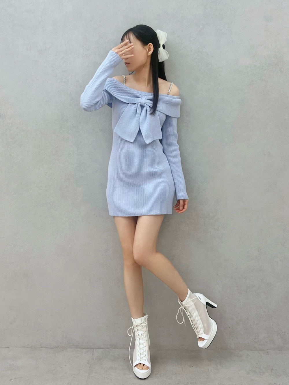 【ワンピース】 デコルテを美しく魅せる、リボンデザインが視線を集めるオフショルニットワンピースです♡ 程よくフィットするリブ編みが、ボディラインを拾いすぎず女性らしいシルエットを演出してくれる1着です。 【シューズ】 高めのヒール✕前ストームで、見た目以上に安定感があり、自然にスタイルアップが叶うショートブーツです♡ レースアップデザインが脚をきゅっと細く見せてくれるのも嬉しいボイントです。 23.5cmのMサイズを着用してます。
