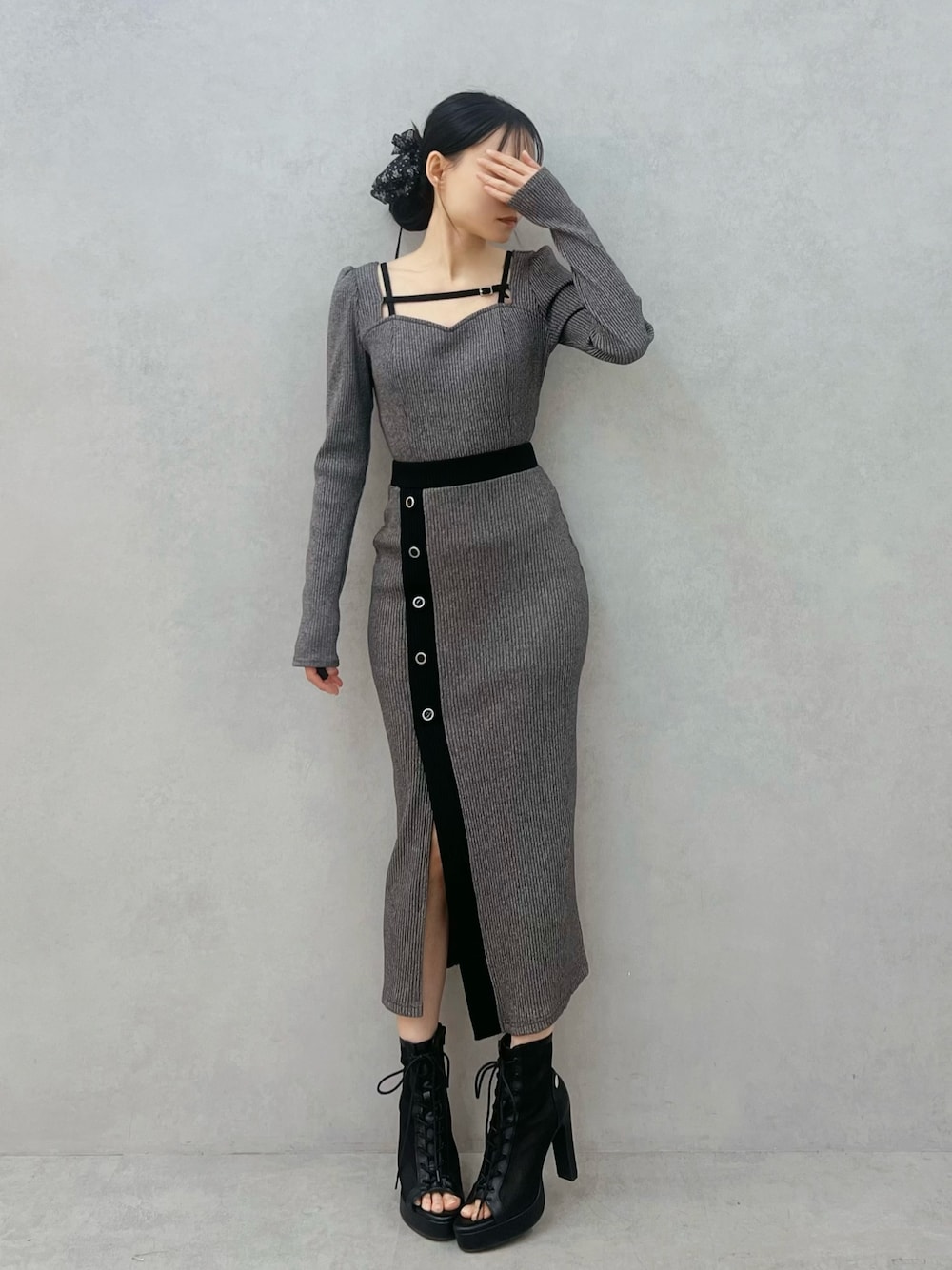 【トップス】 胸元のハートカットラインがデコルテをキレイに魅せてくれるリブトップスです♡ スリムベルトデザインをネック周りに施しった1着です。細めのリブ生地とパネル切り替えを入れて、ボディに沿うシルエットに仕上げました。デイリーにもお出かけにも着回しが効く優秀なアイテムです。 【スカート】 バイカラーがポイントのリブスカートです♡ 程よくフィットするリブ素材で、腰まわりからヒップはすっきり見せつつ、裾にはスリットを入れているので抜け感のある大人フェミニンな印象に◎ 【シューズ】 高めのヒール✕前ストームで、見た目以上に安定感があり、自然にスタイルアップが叶うショートブーツです♡ レースアップデザインが脚をきゅっと細く見せてくれるのも嬉しいボイントです。 23.5cmのMサイズを着用してます。