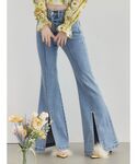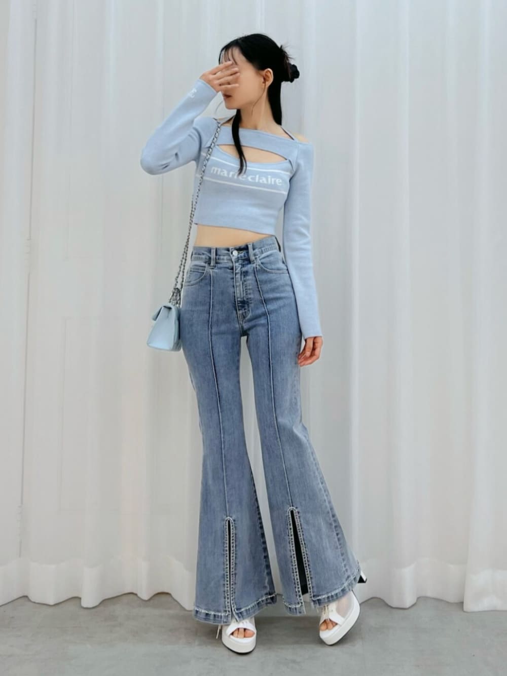 【トップス】 marie claireロゴ入りのニットトップスです♡ 胸元のカットアウトは、程よい肌見せで抜け感を演出します。コンパクトな丈感がウエストラインをきれいに見せてくれる1着です。 【パンツ】 センターライン入りのフレアデニムは脚長効果抜群です♡ 裾スリットあしらったキラキラストーンのディテールがアクセントになり、シンプルながらも今っぽい印象に仕上がります。 【シューズ】 高めのヒール✕前ストームで、見た目以上に安定感があり、自然にスタイルアップが叶うショートブーツです♡ レースアップデザインが脚をきゅっと細く見せてくれるのも嬉しいボイントです。 23.5cmのMサイズを着用してます。 【バッグ】 立体感のあるキルティングとゴールドチェーンが、シンプルなスタイリングにも上品な華やかさをプラスしてくれるバッグです♡ コンパクトながら、スマホ・ミニ財布・リップなど必需品はしっかり収納可能です。