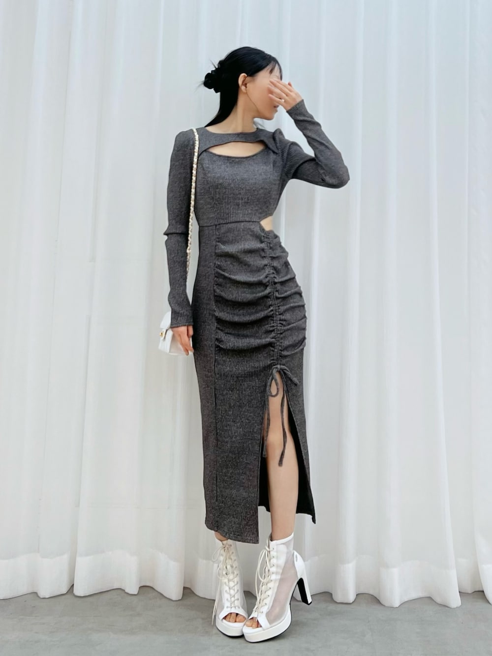 【ワンピース】 美シルエットが女性らしさを演出してくれるワンピースです♡ 伸縮性のあるリブ素材なので、着心地抜群です。モードなデコルテ開きがセンシュアルムードをプラスします。 【シューズ】 高めのヒール✕前ストームで、見た目以上に安定感があり、自然にスタイルアップが叶うショートブーツです♡ レースアップデザインが脚をきゅっと細く見せてくれるのも嬉しいボイントです。 23.5cmのMサイズを着用してます。 【バッグ】 立体感のあるキルティングとゴールドチェーンが、シンプルなスタイリングにも上品な華やかさをプラスしてくれるバッグです♡ コンパクトながら、スマホ・ミニ財布・リップなど必需品はしっかり収納可能です。