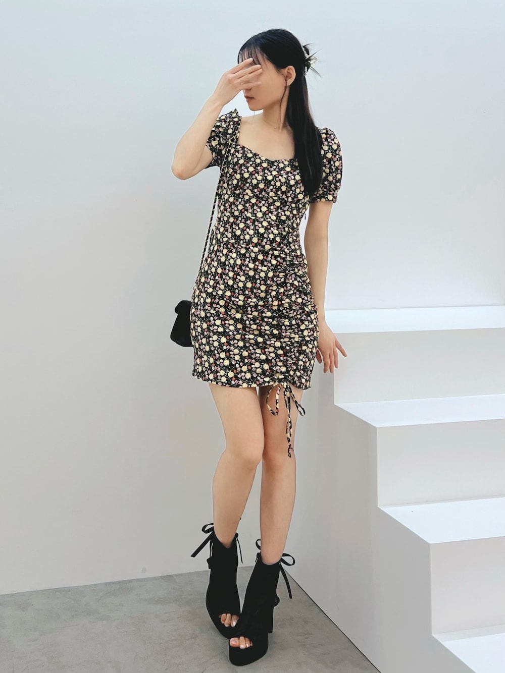 LAM(EATME)のワンピース「【日比谷花壇コラボ】フラワープリントアシンメトリーワンピース」を使ったコーディネート
