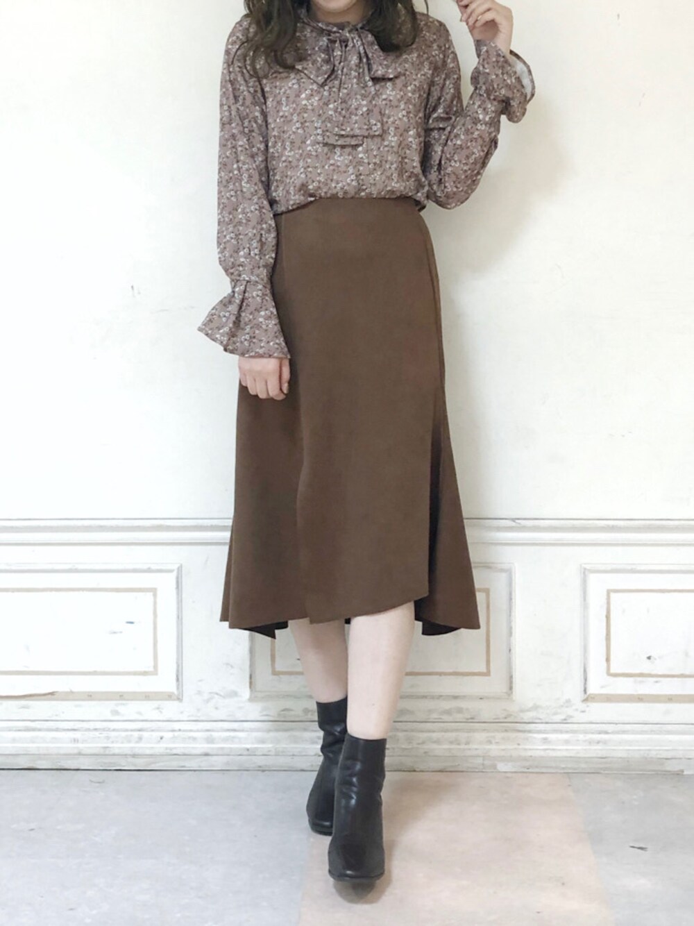 小物までブラウンでまとめ秋らしいコーデに♡スカートはとてもさらっとした生地なので履きやすいです❤︎