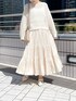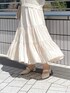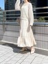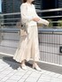 トレンド感のある淡めのワントーンコーデ。スカートは落ち感の出る軽め素材なので、動くたびに裾がゆらゆらと揺れてとっても綺麗です❤︎サテン地なので太陽の光が当たるとツヤツヤと煌めき綺麗ですよ♡トップスはメッシュニットを合わせて、抜け感を意識しました。バッククロスのインナーを合わせて、後ろ姿まで抜かりなく可愛さをプラス…♡合わせているパンプスはローヒール&ストラップ付きなので安定感があり、店頭で一日中履いていても疲れないほど歩きやすいです❤︎