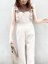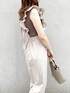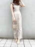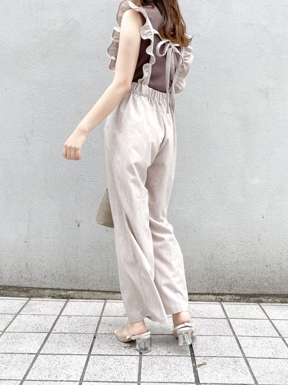 おすすめ甘カジュアルコーデ♡【サロペット】こちらのサロペットは身長163cmで踝丈くらいでした♪高身長の私はフリーサイズだと丈が短くなってしまうことが多いのですが、こちらのサロペットは丁度いい丈感で着ることができたので高身長さんにもオススメです♡低身長の方は高めのヒール合わせがおすすめ◎サロペットといえばカジュアルになりがちですが、こちらのアイテムは淡めのカラー×大振りのフリルとバックリボンでフェミニン要素の詰まったフェミニン好きさんにもおすすめのサロペットになっています❤︎【トップス】サロペットのデザインを引き立たせる為、インナーはシンプルに♡【小物】バッグはコーデに合わせてブラウン系で統一し、足元は抜け感がでるようにクリアサンダルをチョイス❤︎デート服やピクニックにおすすめのコーディネートです◎