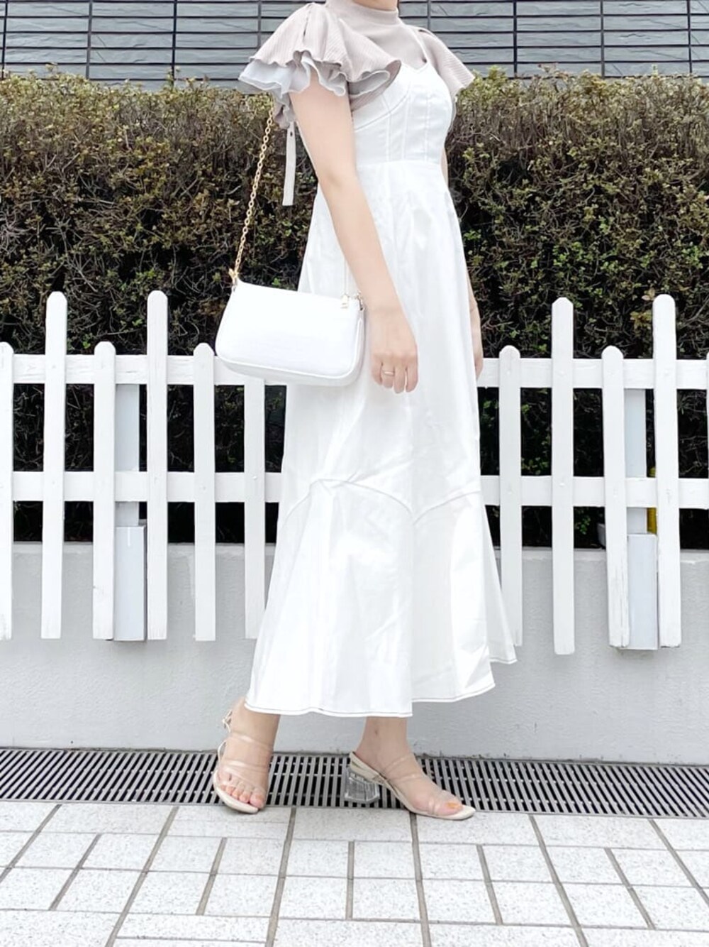 甘めの淡色カラーコーデ♡【ワンピース】私もリアルバイしたお気に入りのキャミワンピース❤︎胸下切替なので、着るだけでスタイルアップして見えます◎私が着用しているオフホワイトのカラーは、ステッチがブラウンなところも特にお気に入りのポイントです!ブラックではなくブラウンの為ステッチでもキリッとしすぎず柔らかい印象で着て頂けるので、甘めがお好きな方におすすめです♡【トップス】大ぶりのフリルが華やかな印象にしてくれるトップス♡フリルが二の腕もカバーしてくれるので着痩せ効果も❤︎【サンダル】足元はクリアサンダルを合わせてコーデに抜け感が出るようにしました♪甲の部分だけでなく踵もクリアになっているのが可愛くてお気に入りです♡