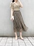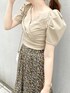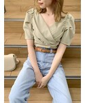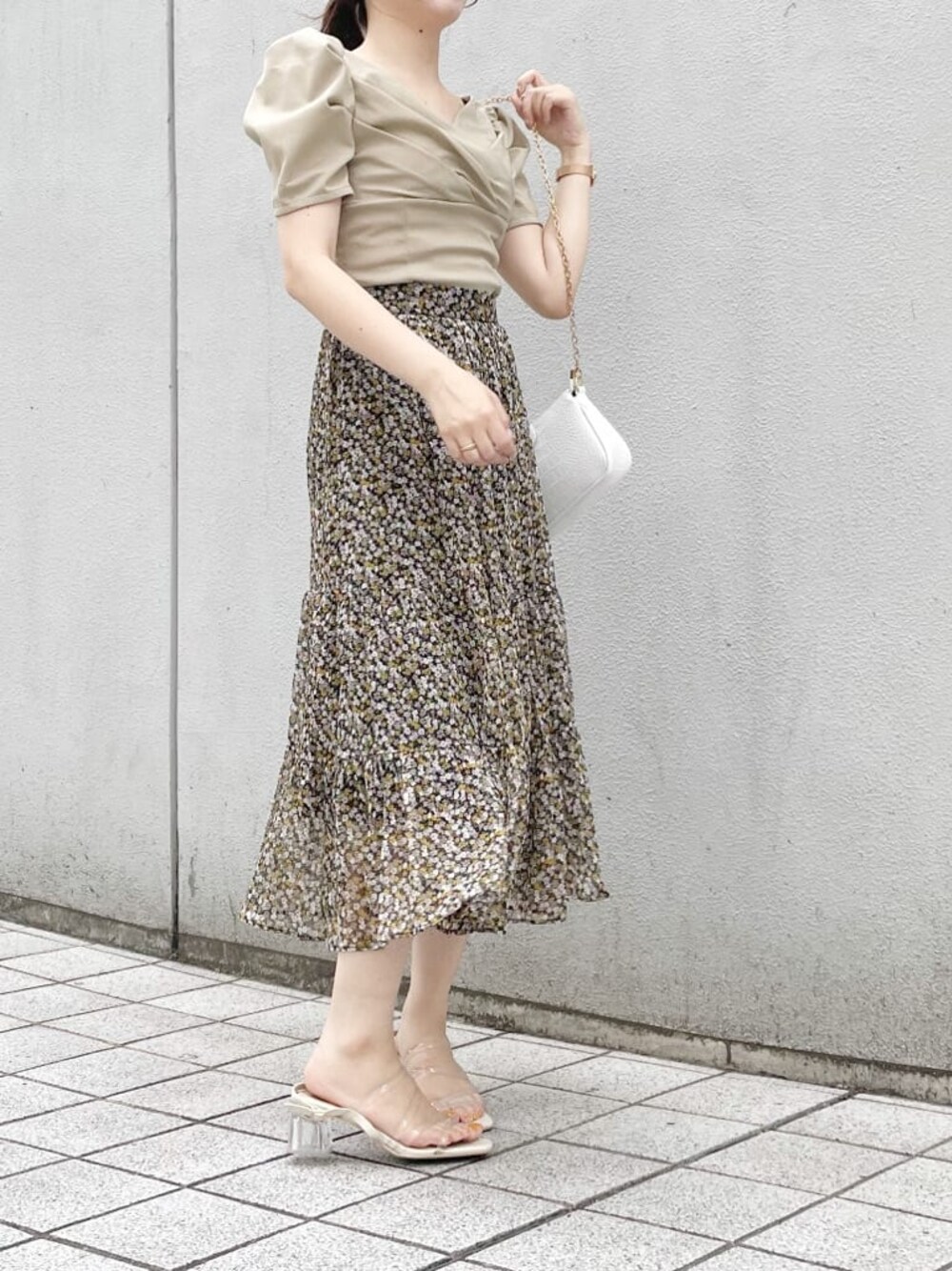 【トップス】お袖のボリュームがポイントのトップ♡カシュクールデザインなので胸元の空き具合が心配だったのですが、着てみるとフィット感があり空き具合も全く気になりませんでした!カシュクールデザインのトップスはお顔周りがすっきり見えるのでオススメです♡【スカート】ティアードデザインが今年らしいスカート♡こちらはサイドファスナーになっており、後ろはゴムなので伸縮性があり履きやすいです❤︎ダークミックスのカラーは大人っぽく着て頂けるので、甘くなりすぎずに花柄を着たい方におすすめです◎【シューズ】サンダルはクリアサンダルを合わせて、足元に抜け感を出しました♪低めのヒールなので安定感がありとっても歩きやすいです♡