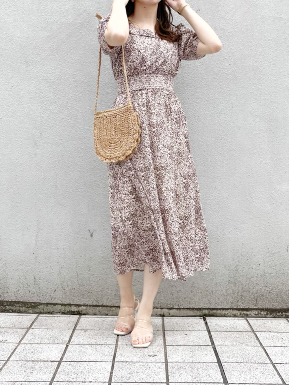 【ワンピース】大人っぽい小花柄が可愛いワンピース❤︎後ろはレースアップになっているので、ウエストをきゅっと絞ることができます◎こちらのワンピースはボタンやファスナーがないので、忙しい朝でも10秒あればさくっと着ることができちゃうところが嬉しいポイント!お顔周りはスクエアネックになっているので、甘くなりがちな花柄ワンピースでもスッキリ着て頂くことができます❤︎秋はGジャンやライダースと合わせて頂いても可愛いです♡【サンダル】足元はクリアサンダルを合わせて足元に抜け感をプラス♪dazzlinのシューズはとても歩きやすく長時間履いていても全然疲れないので、プライベートでも沢山履いています❤︎私は足のサイズ23.5~24cmなのですが、こちらのサンダルはLサイズでピッタリでした♪
