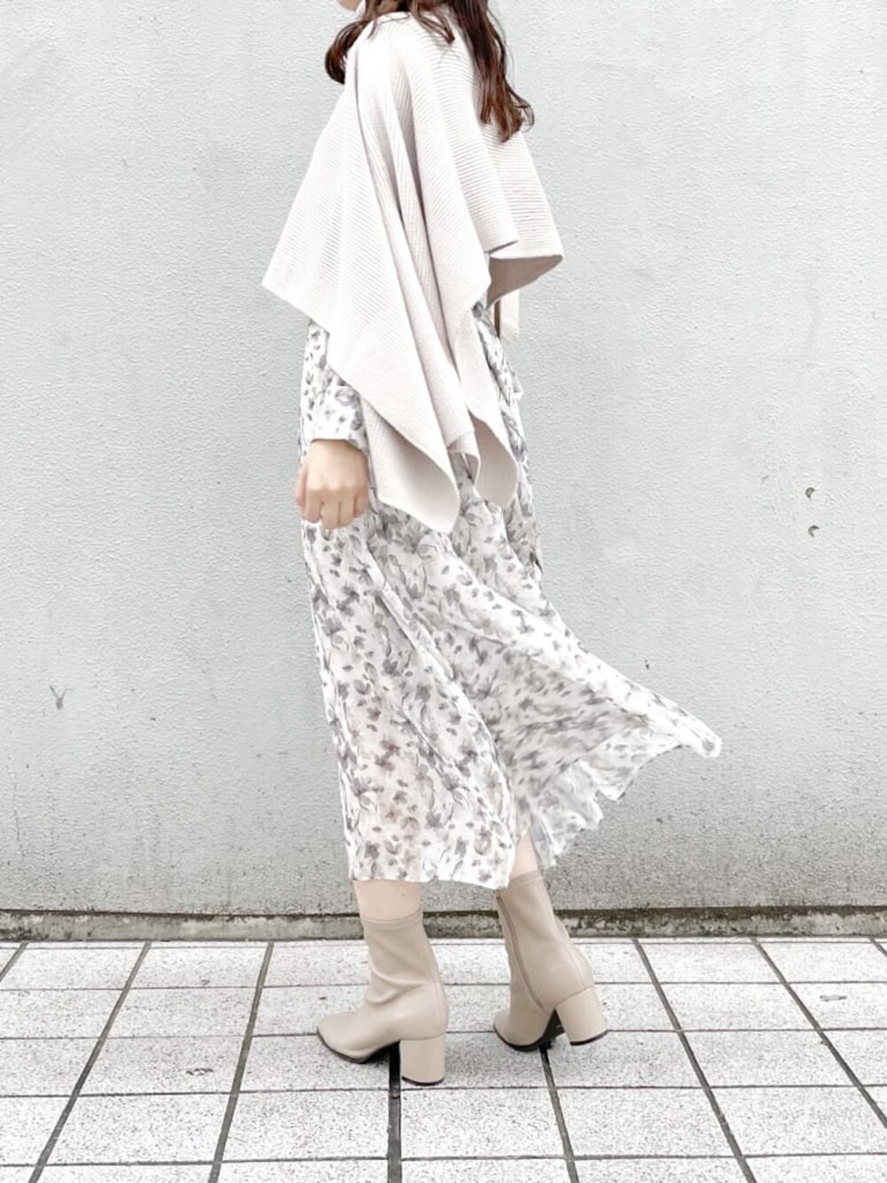秋もやっぱり淡色ワントーン♡いつものコーデにケープを足すだけで、お洒落コーデに早変わり♪【ワンピース】夏にも大人気だったカメレオンワンピースが、長袖ver.になって登場!こちらの花柄はdazzlinオリジナル柄となっており、水彩のような柔らかいタッチのお花柄なので女性らしく着て頂けます♡ウエスト部分はシャーリングになっているので伸縮性があり、着心地もとてもいいです◎ウエスト位置のリボンは、前後どちらでも結んで頂くことが可能です!個人的には後ろで結んだ方がウエスト部分がすっきり見えるのでおすすめです❤︎【ケープ】マンネリコーデの強い味方❤︎ ケープを重ねるだけで脱マンネリ化出来るのでこの秋のマストアイテム!こちらのケープは、左右で袖の長さが違うイレギュラーデザインなところがお気に入りです♡上品なシンプル編地なので、お手持ちのアイテムにもサラッと使えるところが嬉しい♡【ブーツ】私もリアルバイしたお気に入りのブーツ♡とっても柔らかいので、長時間履いていても靴擦れしたりせず本当に履きやすいのでおすすめです!私は足のサイズが23.5cmで、Lサイズを購入しました♪