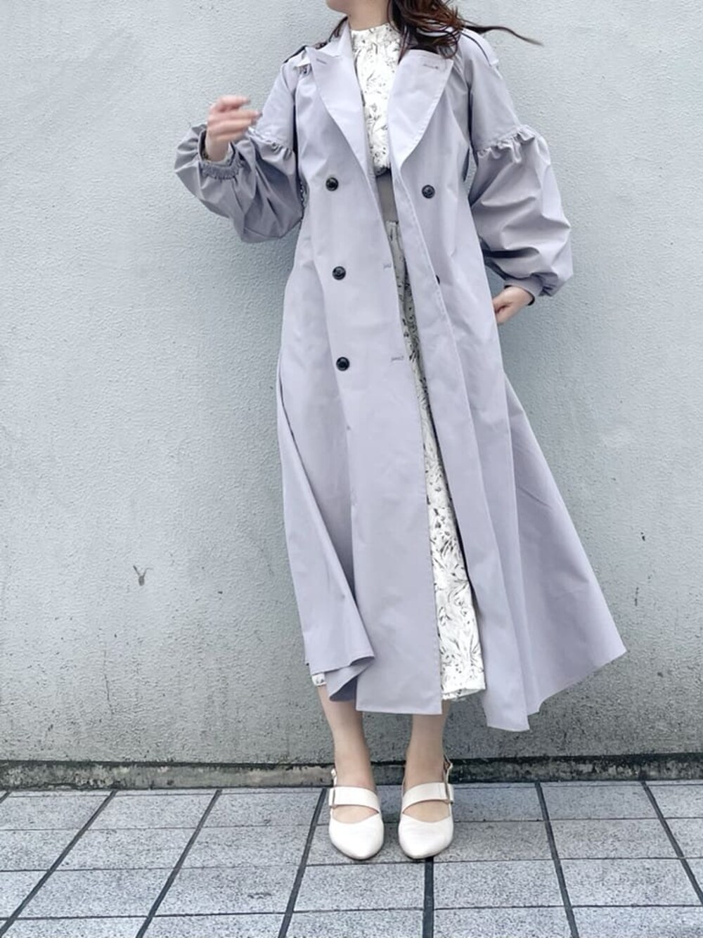 爽やか春コーデ❤︎【アウター】一枚で主役級トレンチコート❤︎カラー名はグレーですが、淡いブルーとパープルの中間のような絶妙なお洒落カラーなんです♡お袖の部分にはゴムが入っているので、少しお袖を上げて着るとお袖がふんわりとしてくれて可愛いです♪ハリ感のあるお素材なので高級感も◎【ワンピース】淡い花柄がdazzlinらしいワンピース♡ウエスト部分がリブになっているのでスタイルアップ効果も◎【パンプス】ポインテッドトゥなので女性らしさを演出してくれるパンプス♪私は足のサイズが23.5cm-24cmで、Lサイズを購入しました♡