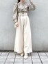 淡色でまとめた綺麗めコーデ♡【ブラウス】小花柄が春らしくて可愛いブラウス❤︎お袖の部分も少しふわっとしているので女の子らしい雰囲気で着て頂けます♡襟の部分は取り外しが可能なので、5枚目の写真のように外して着て頂くのもおすすめ◎印象が大分変わりますよね♪【パンツ】裾がフレアになっているので足元をすっきりと見せてくれます♡私は骨盤が広いところがコンプレックスなのですが、こちらのパンツはラインを拾いにくいのでとても履きやすかったです❤︎