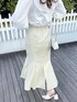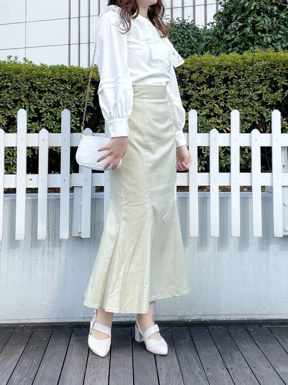 お花見にもピッタリな爽やかブラウスコーデ♡【トップス】襟元のレースがポイントのブラウス♡お袖の部分は少しふわっとしているので、女の子らしい雰囲気で着て頂けます❤︎なんと襟は取り外し可能なので、シンプルに着たい時には外しても◎【スカート】毎日店頭でも大人気の、美シルエットスカート♡淡いグリーンのカラーなので履くだけで春らしい印象に♪腰回りのラインも拾いにくいので、履いて頂きやすいです❤︎【パンプス】ポインテッドトゥなので女性らしさを演出してくれるパンプス♪私は足のサイズが23.5cm-24cmで、Lサイズを購入しました♡踵の部分にクッションが入っておりとっても歩きやすいので、毎年色違いで購入してしまうほどお気に入りです❤︎