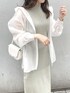 爽やか夏コーデ❤︎【シアーシャツ】キラッとした光沢感が綺麗なシアーシャツ♡ヒップが完全に隠れる丈感なので、気になる骨盤やヒップラインをカバーしてくれる優れものです◎ 【ワンピース】カーディガンタイプのトップスとノースリーブのワンピースがセットになったアイテムで、今回はインナーのワンピースのみ着用しています♡こちらはさらっとした軽いお素材なので、夏場も着て頂きやすいです❤︎ 【バッグ】私もリアルバイしたバッグ♡小さめのサイズ感ですが、マチがしっかりあるので折り畳みのお財布やお化粧直し用のリップもしっかり入ります◎【シューズ】去年も大人気だったクリアサンダル♡こちらのサンダルはヒールが太めなので、安定感があり履きやすいです♪私は足のサイズが23.5cm-24cmで、Lサイズを購入しました❤︎