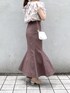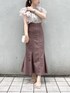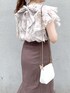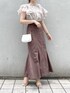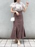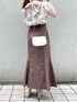 ブラウンカラーで秋先取りコーデ♡【ブラウス】店頭でも毎日大人気のブラウス♡お袖のフリルはボリュームがあるので、ノースリーブでも二の腕の露出感をカバーしてくれます♪ノースリーブが苦手な私でも着やすかったです!後ろのリボンが可愛いですよね♡【スカート】【スカート】私もリアルバイした美シルエットスカート♡こちらのスカートはマーメイドシルエットですがラインを拾いにくい柔らかいお素材なので、骨盤の張りにコンプレックスをお持ちの方も履いて頂きやすいです!赤みのあるカラーなので、秋口にはトップスにブラックを合わせて頂いても暗くならずに履いて頂けます♪【シューズ】去年も大人気だったパンプスが今年も登場♡私は足のサイズが23.5cm-24cmで、Lサイズを購入しています♪太めのヒールで安定感があるので歩きやすいです♡