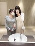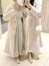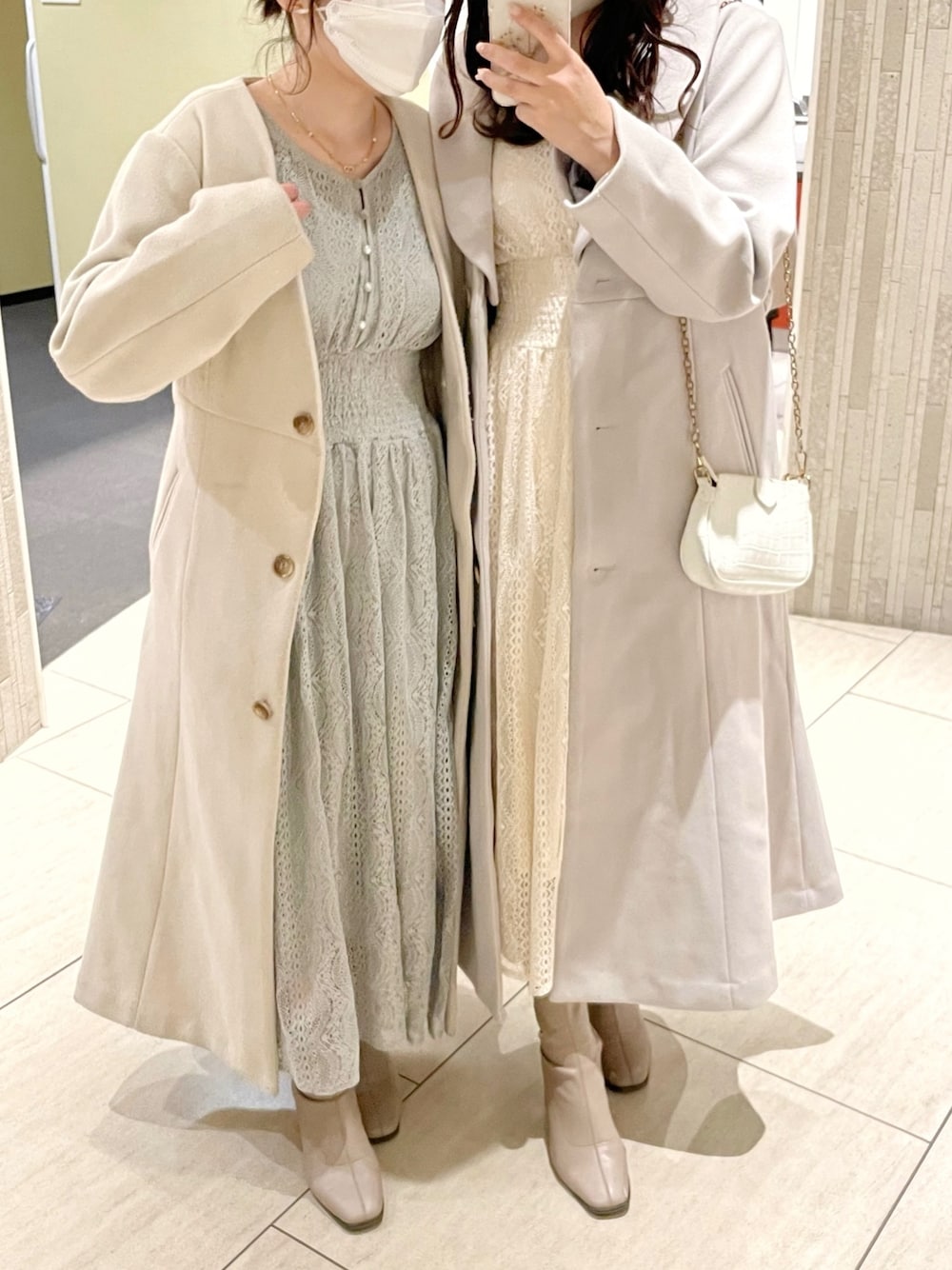 色違いコーデ❤︎アウターの襟は取り外し可能で、左スタッフ(身長150cm)→襟なし 右スタッフ(163cm)→襟あり で着ています♪中に着ているレースのワンピースは襟のフリルがポイント♡ウエスト部分はシャーリングになっているので着心地も抜群です♡